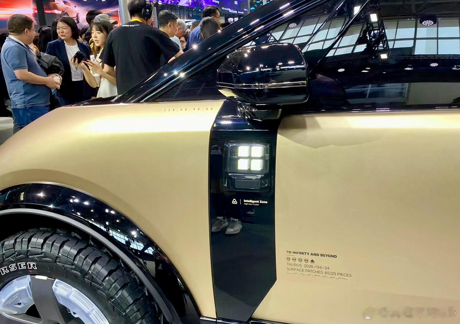 iCAR X序列首款概念车,把冲突美学玩到了极致。OneBox单厢造型,上半部分是顺滑低风阻的流线车身,下半部分却配了高离地间隙、大轮毂与宽体轮眉,科幻感和硬派越野气质撞出了独一份的风格。