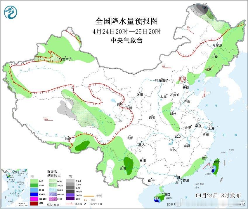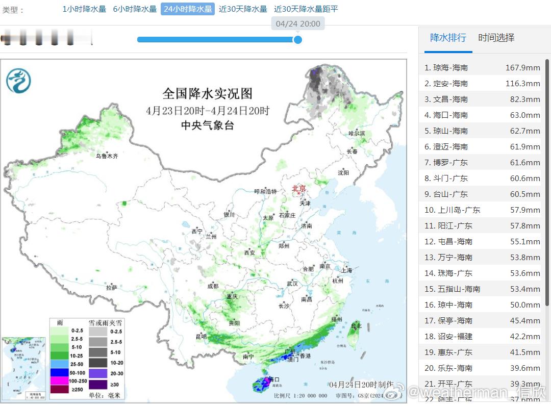 【强降水】昨晚到今天,海南岛成为全国降水最强的区域,冷暖交汇之下,包括海口在内,多地出现暴雨,琼海167.9毫米、定安116.3毫米,均为大暴雨,而且琼海和定安,也打破当地4月单日降水量纪录。此外,受到冷涡影响,内蒙古东北部和黑龙江西北部出现雨雪混杂的情况。