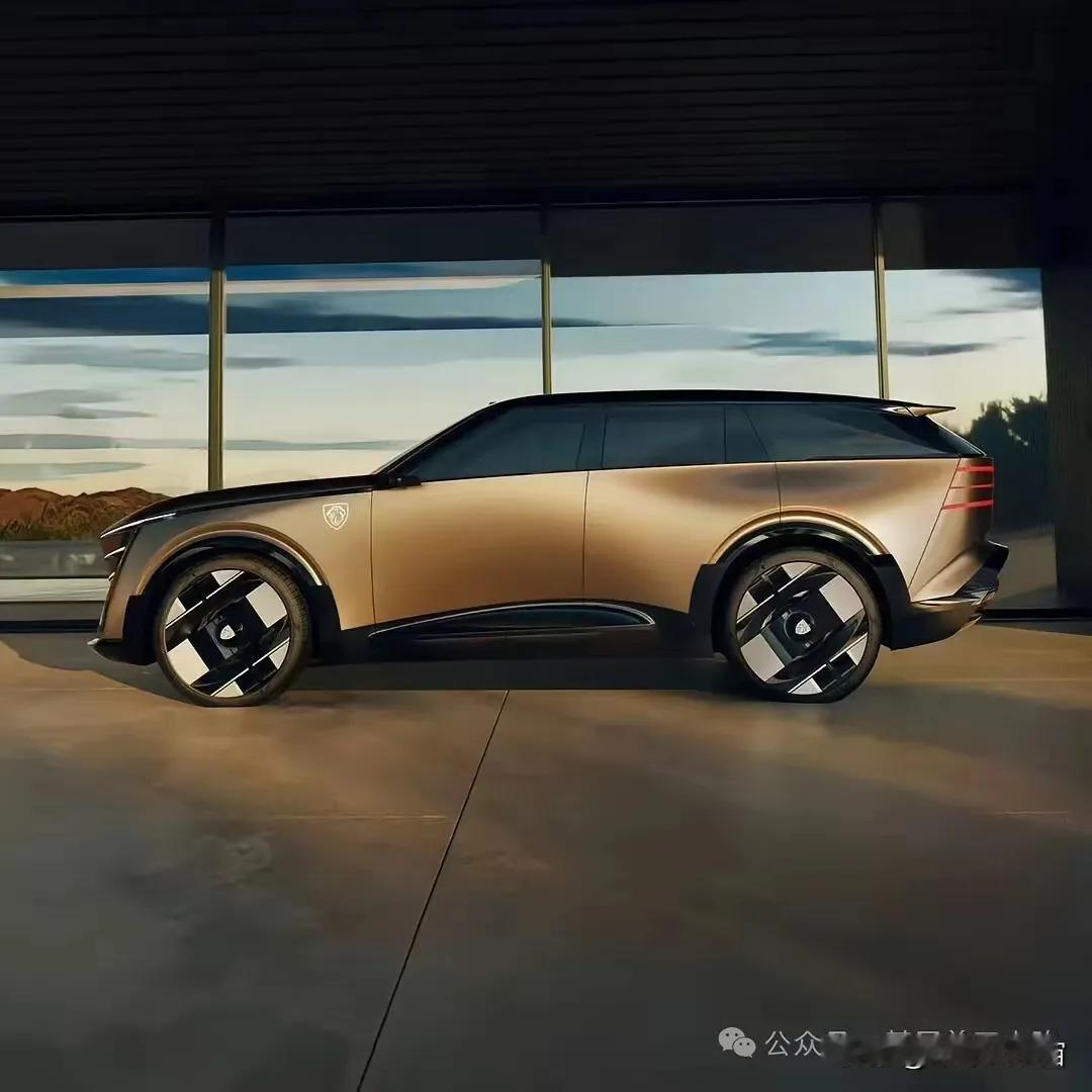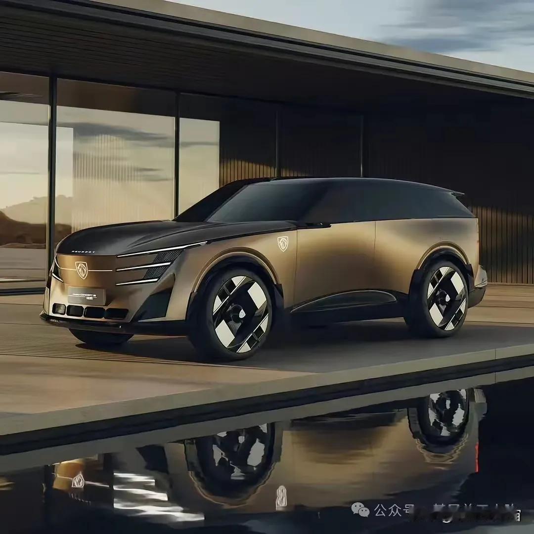 标致 Concept 8 琉明:大型纯电SUV,淡金色、发光狮标、车顶激光雷达、电子外后视镜、双尾翼。