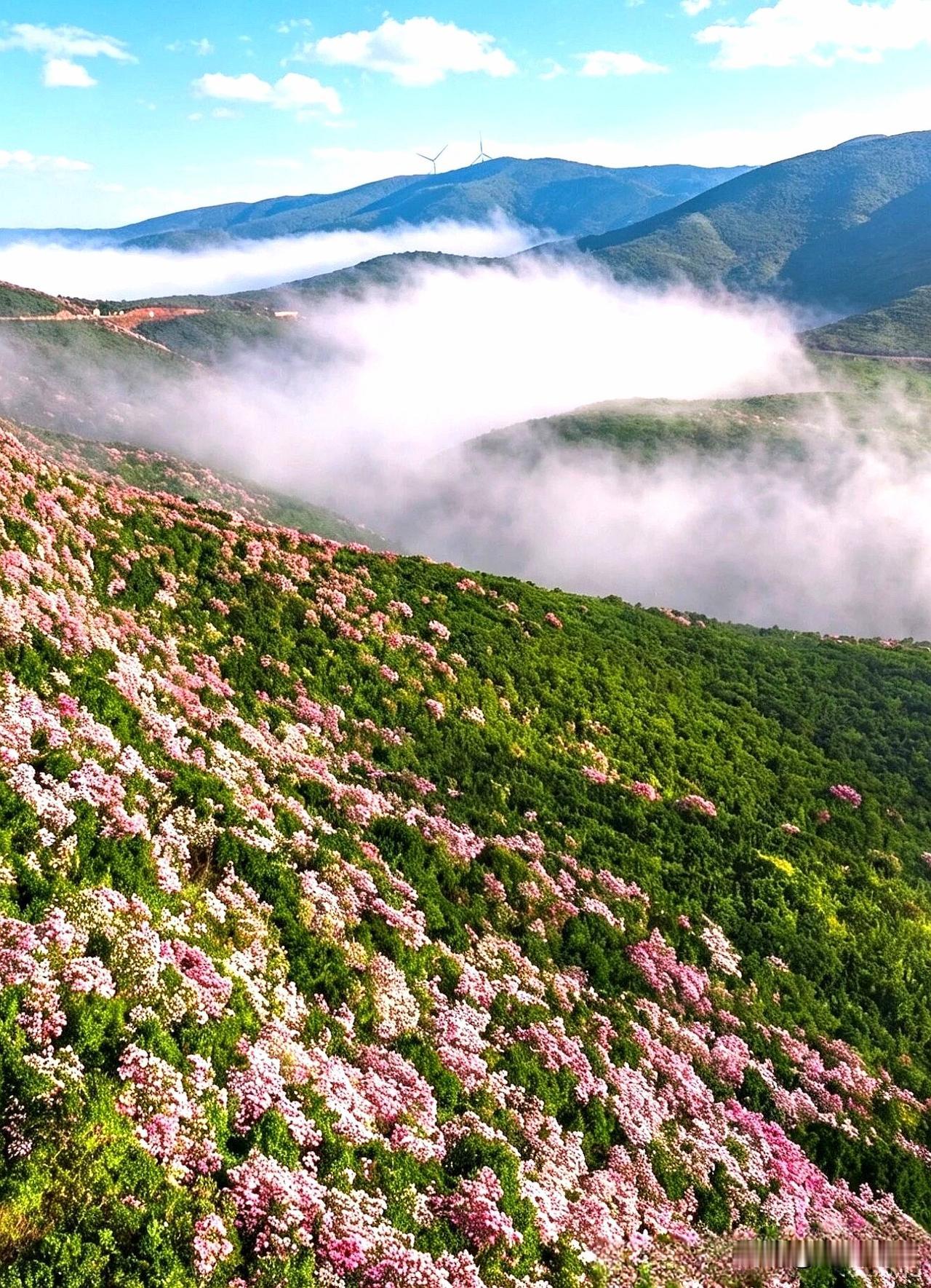 这一片高山杜鹃,像是开在云端,没有任何的商业痕迹,有的只是怒放在山巅云海的杜鹃,有的只是刚刚开通延伸到云海的公路,路边的黄土还是新鲜的,还没有被青草覆盖。