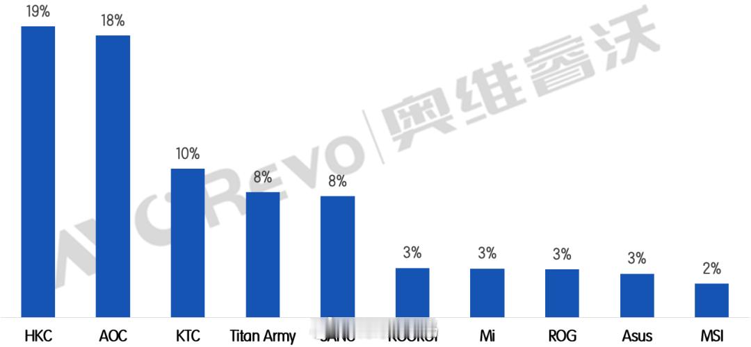 小米销量占比10%,排名第三;销额占比7%,排名第三;同时在电竞显示器方面以3%的占比排名第七。