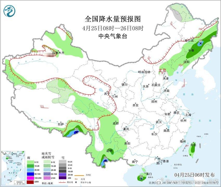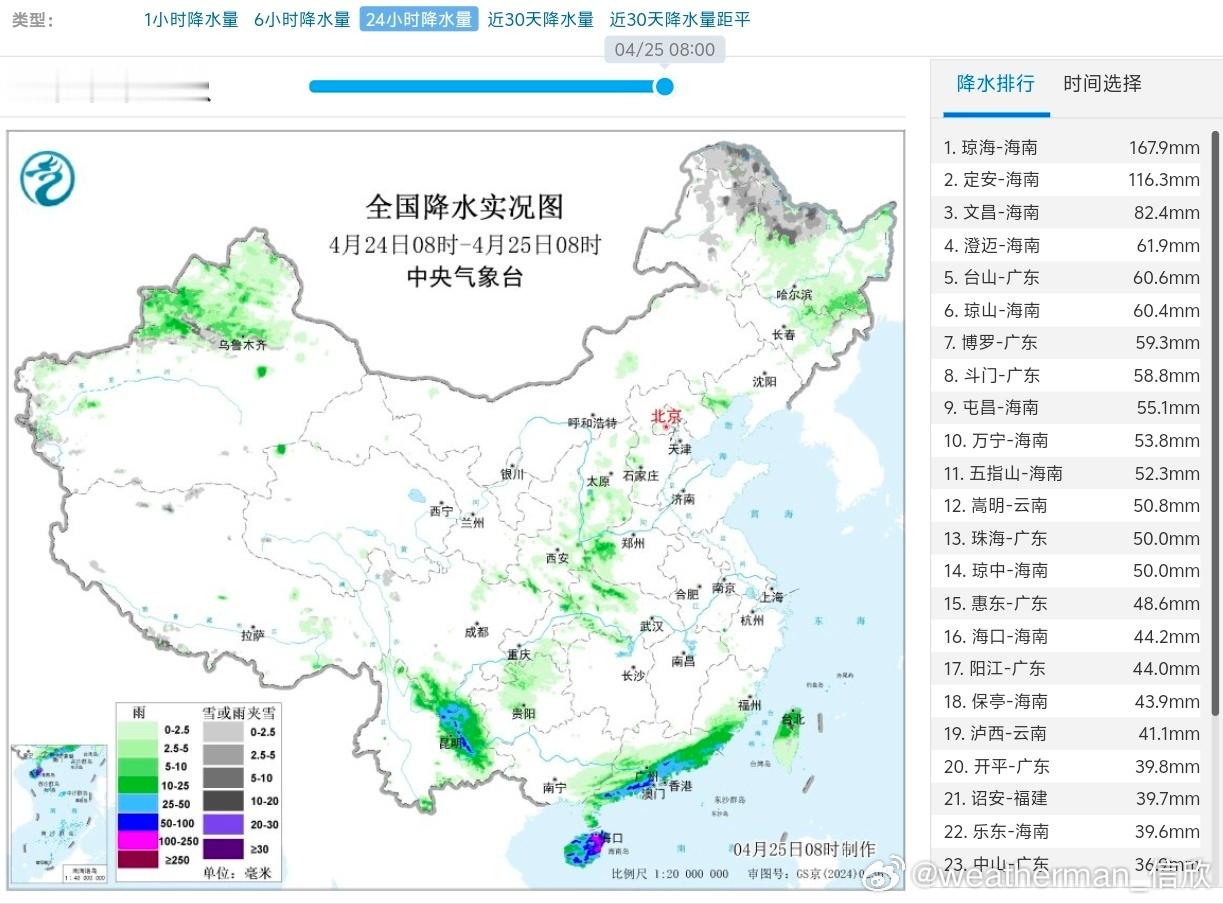 【强降雨和强对流】昨天到今晨,海南广东台湾一带,因为低空切变线影响,出现强降雨。海南琼海和定安出现大暴雨并打破4月单日降水量纪录。另外,从西南到东北多地,也出现对流,山西等地出现雷暴大风。今天南方降水总体减少,但在西藏东南部、云南南部、海南岛南部,还有些大雨或暴雨。