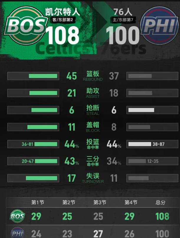 108-100,看着稳,过程跟走钢丝没区别。第三节马克西一个人抡出12-0,76人从落后直接反超,北岸花园那帮球迷嗓子都喊劈了。我当时真以为绿军要交代。塔图姆上半场9中3,除了扔三分就是跟裁判摊手,我看着都着急。这人啊,常规时间跟划水似的,最后两分钟连着两个顶人三分——一个是拆炸弹,一个是往自己篮筐里扔雷,区别全看他进不进。