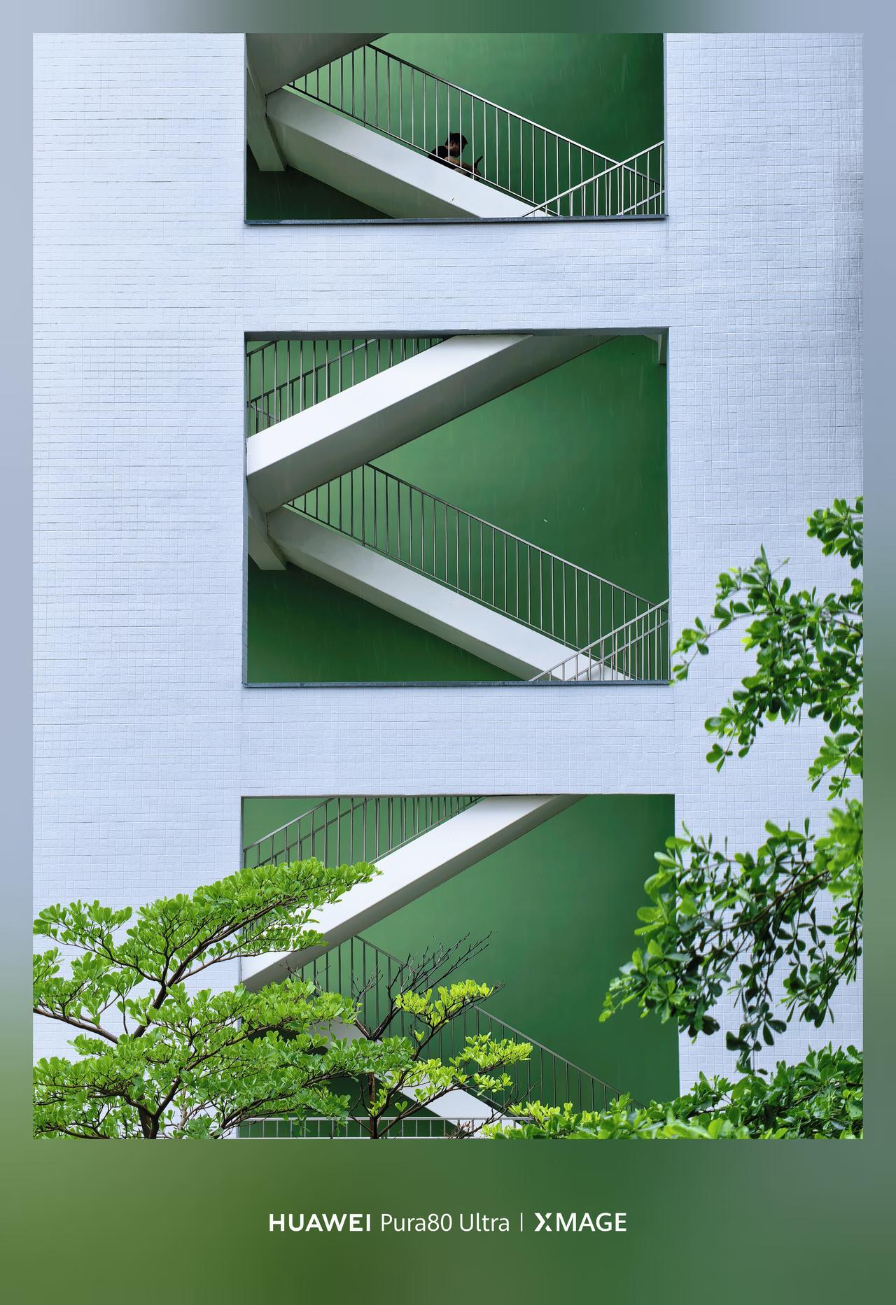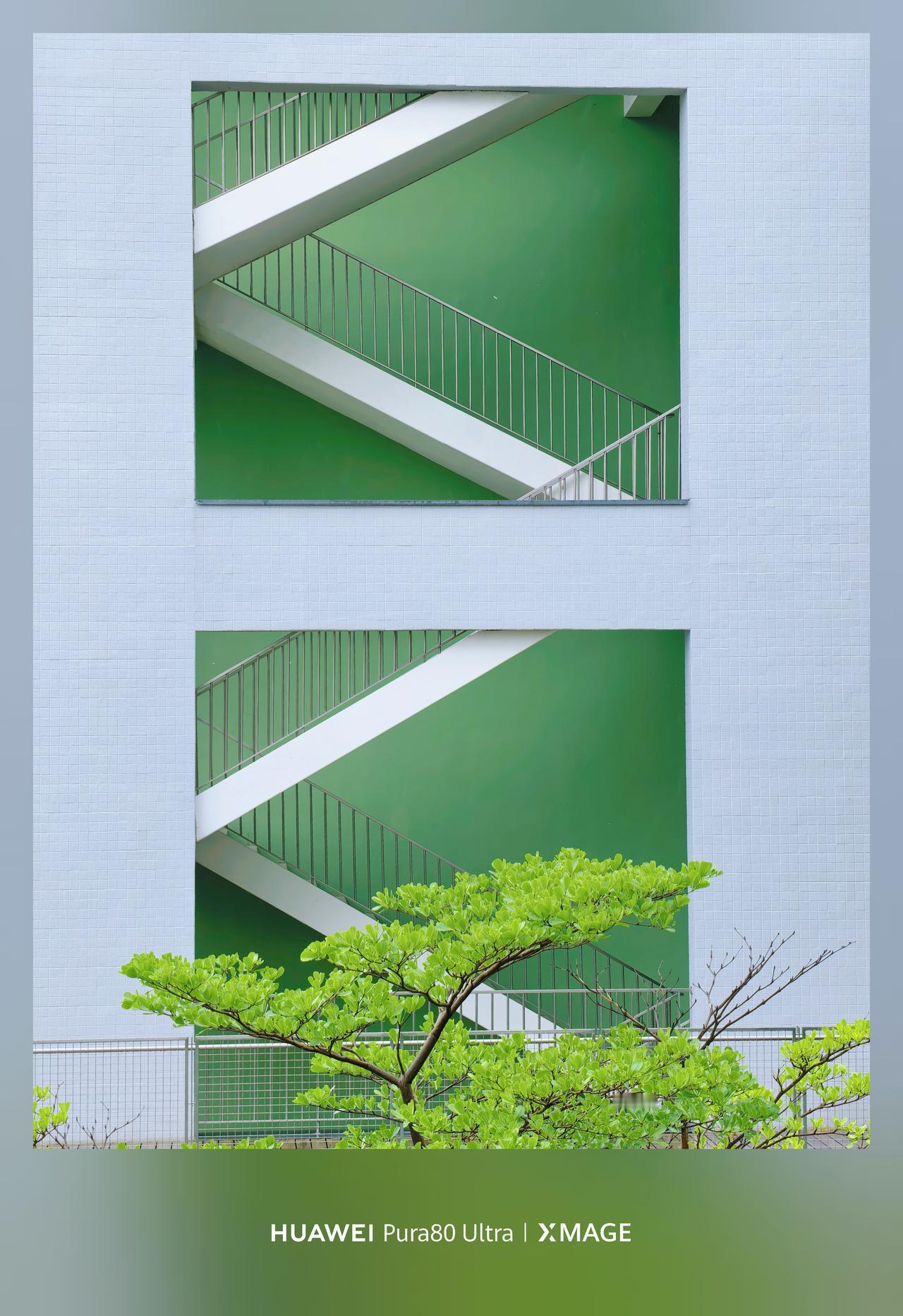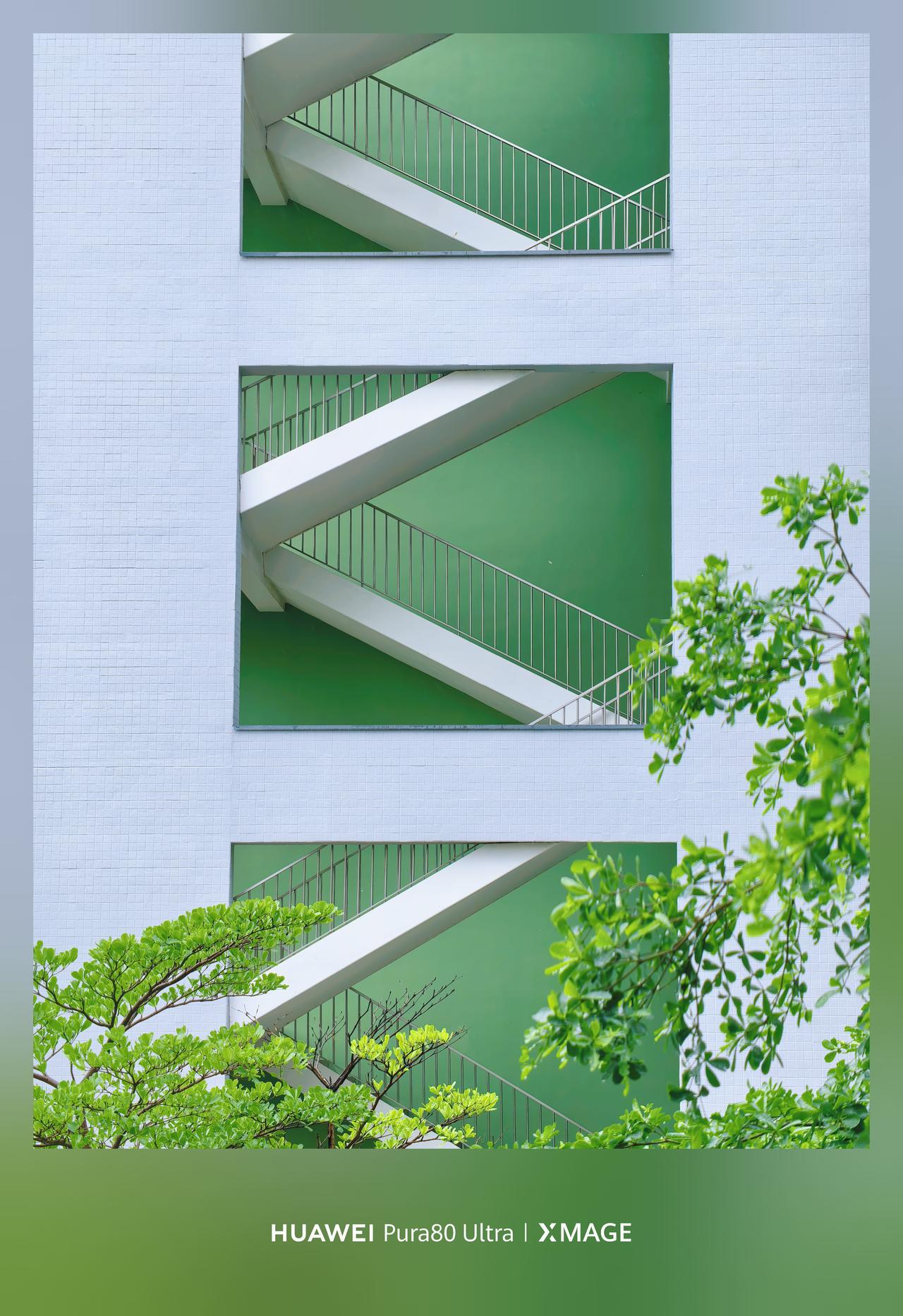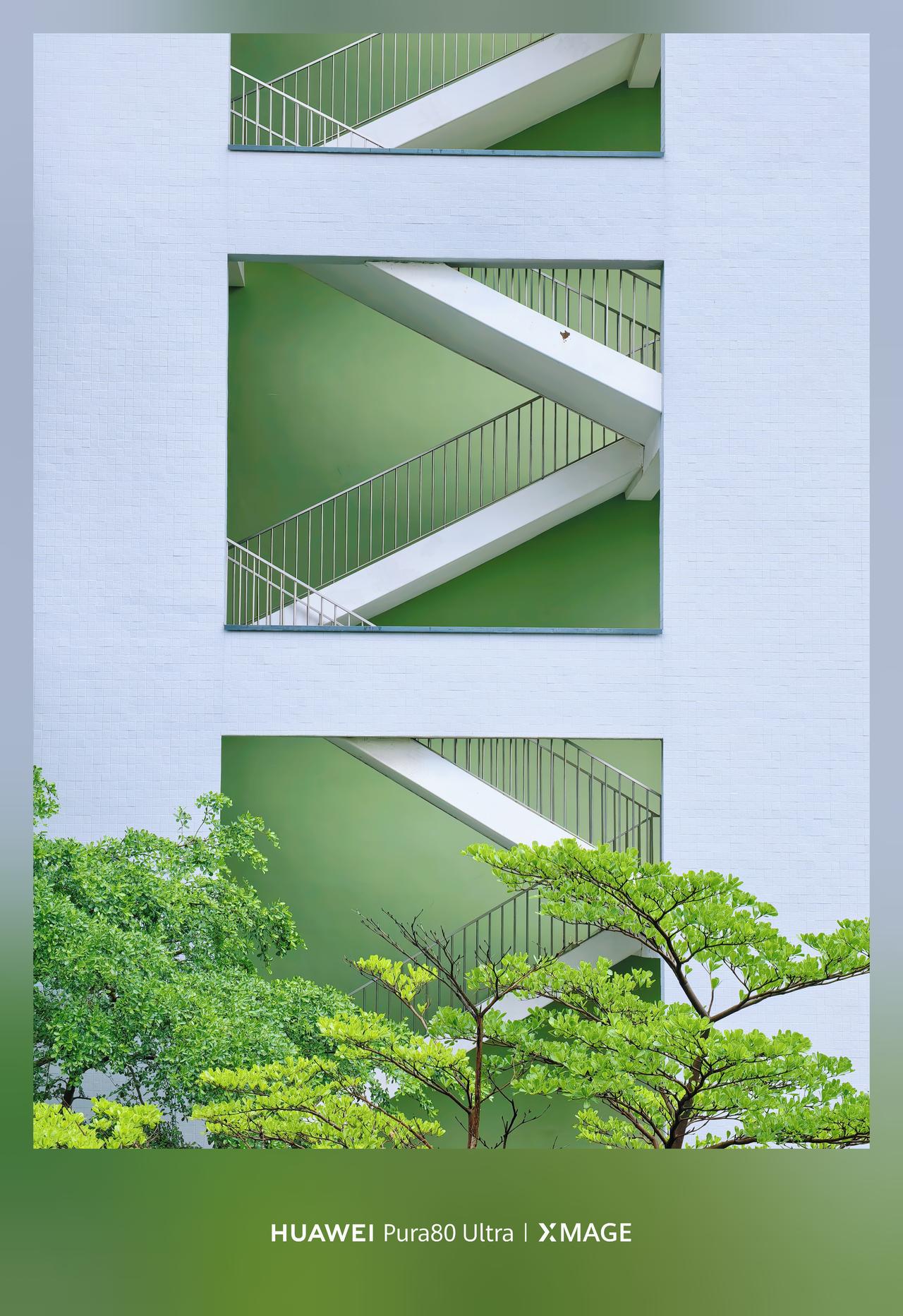 几何感和色彩撞的好好看!白墙亮绿底,衬着白楼梯,楼梯的身给影照片添加了生命力~