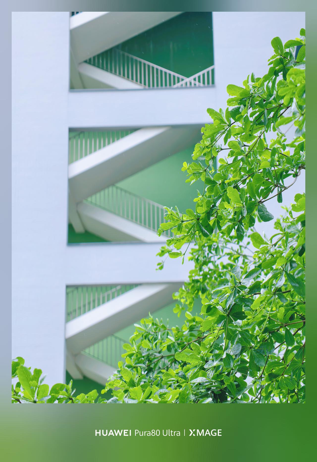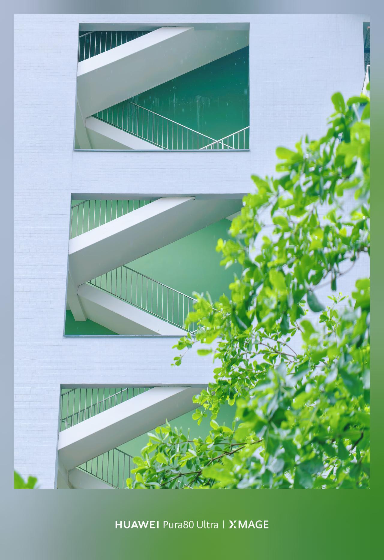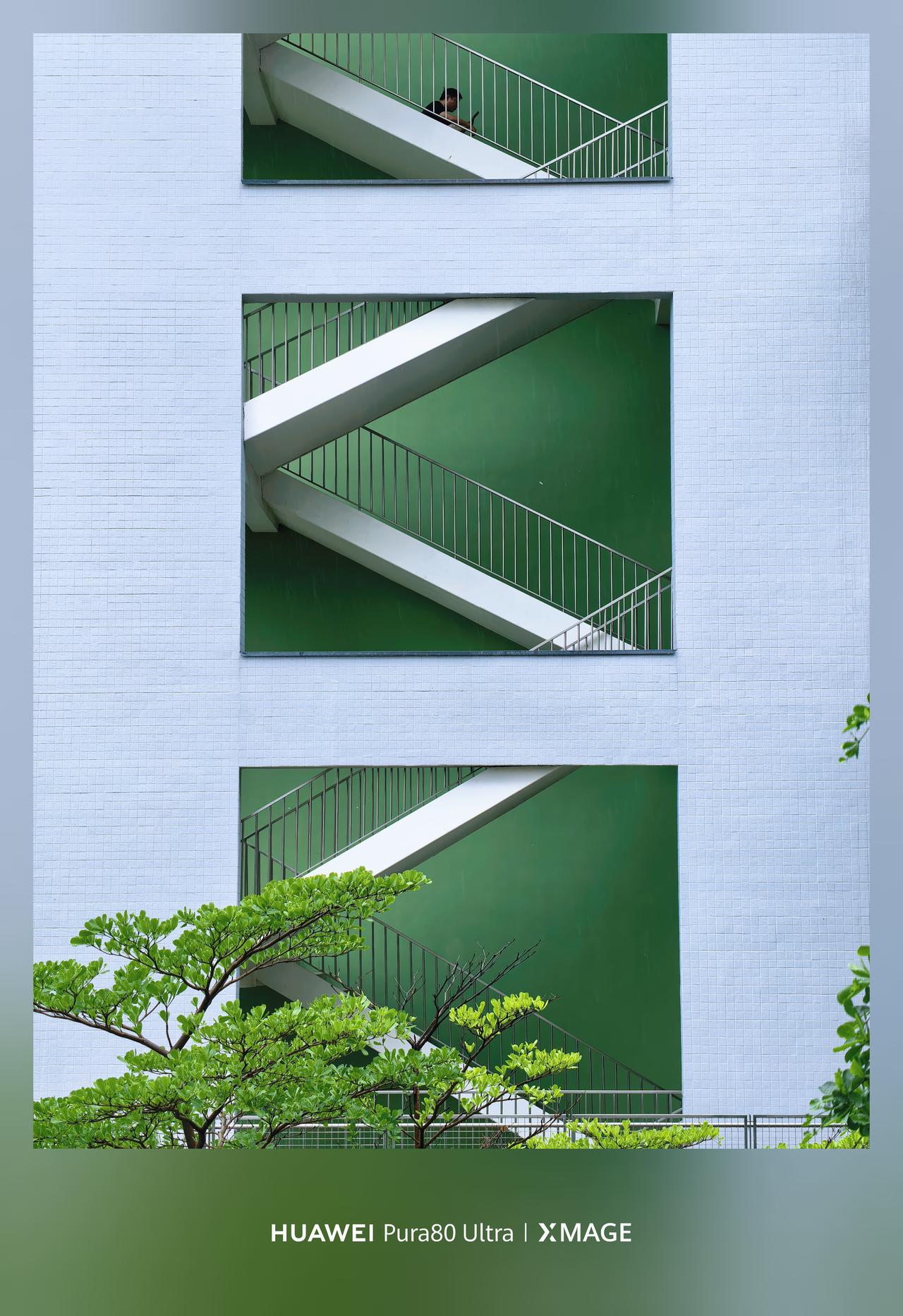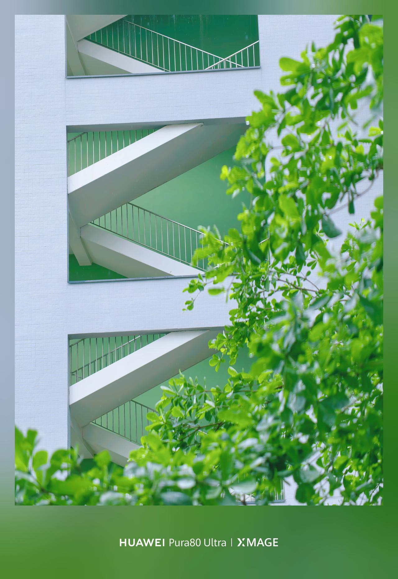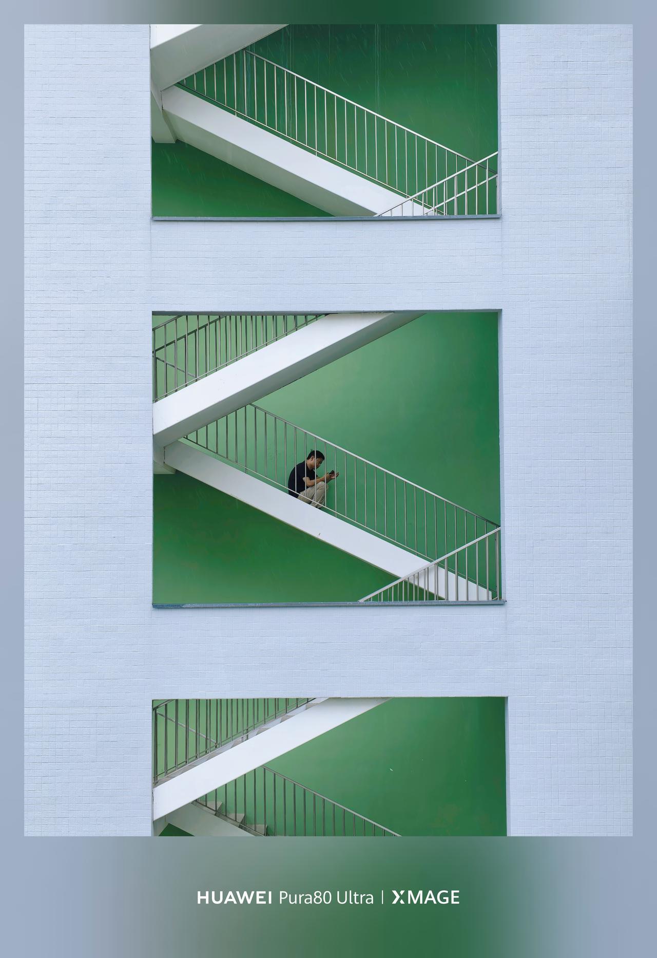 几何感和色彩撞的好好看!白墙亮绿底,衬着白楼梯,楼梯的身给影照片添加了生命力~