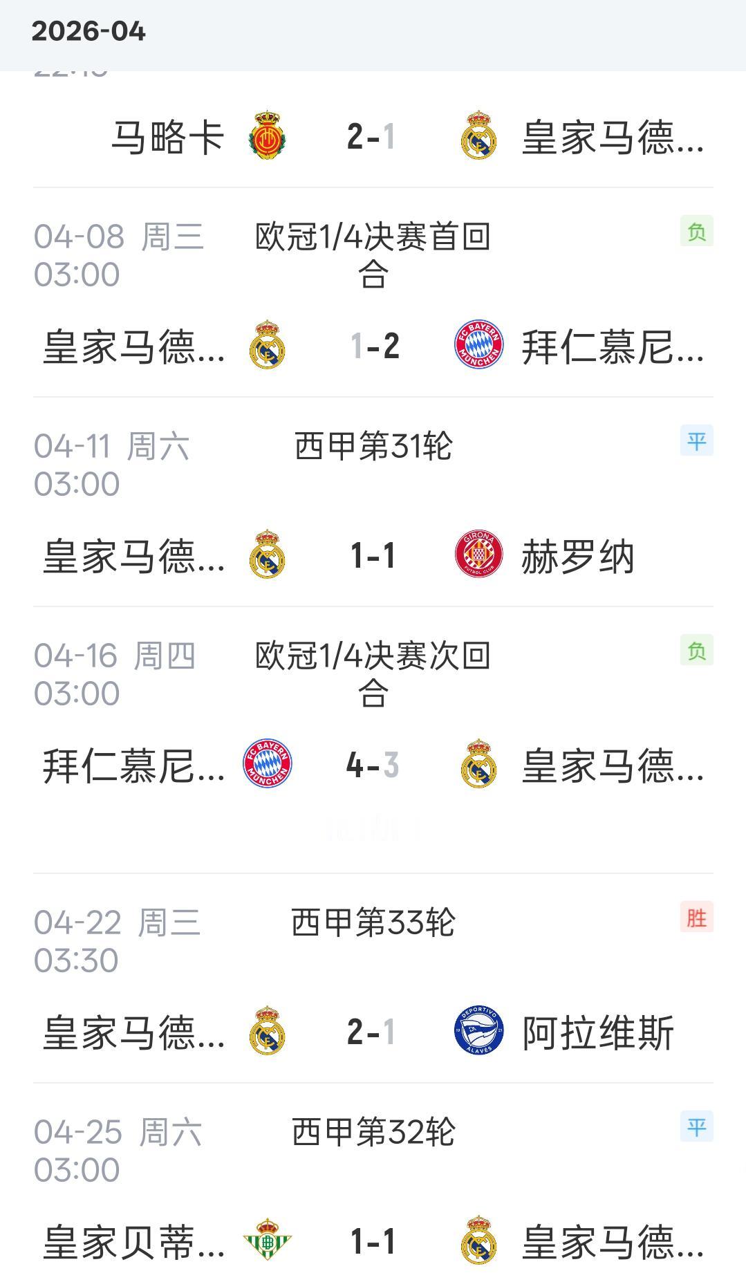 1:1战平贝蒂斯之后,皇马四月份六场比赛仅仅取得了1胜2平3负的战绩,不但西甲联赛已经彻底无望,欧冠联赛也黯然出局,已经确定了赛季四大皆空的结局!