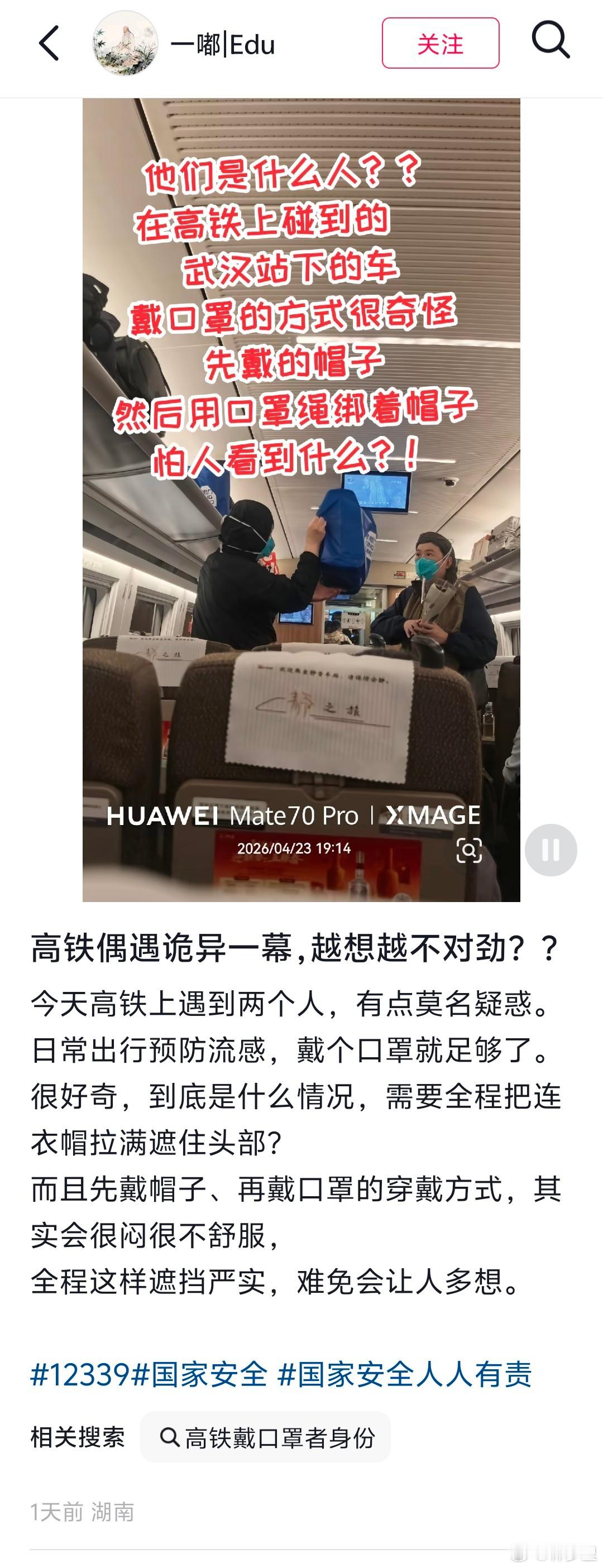 高铁上戴帽子戴口罩,被ptsd看见,又投诉了。