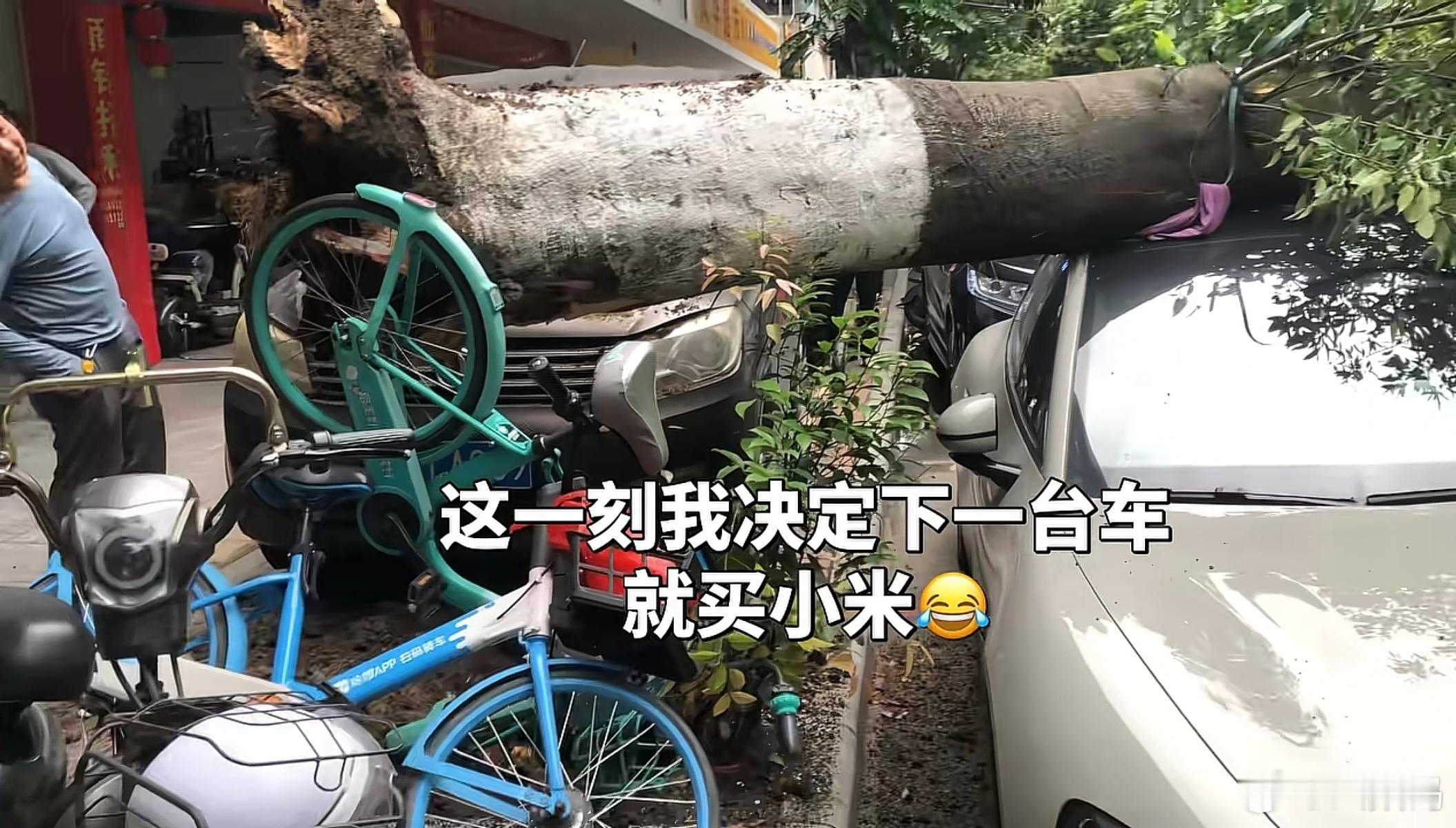 啥才是“安全”?看看这台小米SU7,硬扛倒下的大树,车身无明显变形,甚至连玻璃都