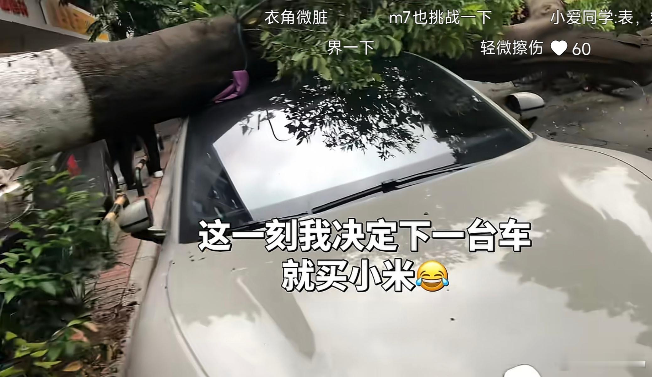 看看这台小米SU7,硬扛倒下的大树,车身无明显变形,甚至连玻璃都没碎,只是“轻微擦伤”。