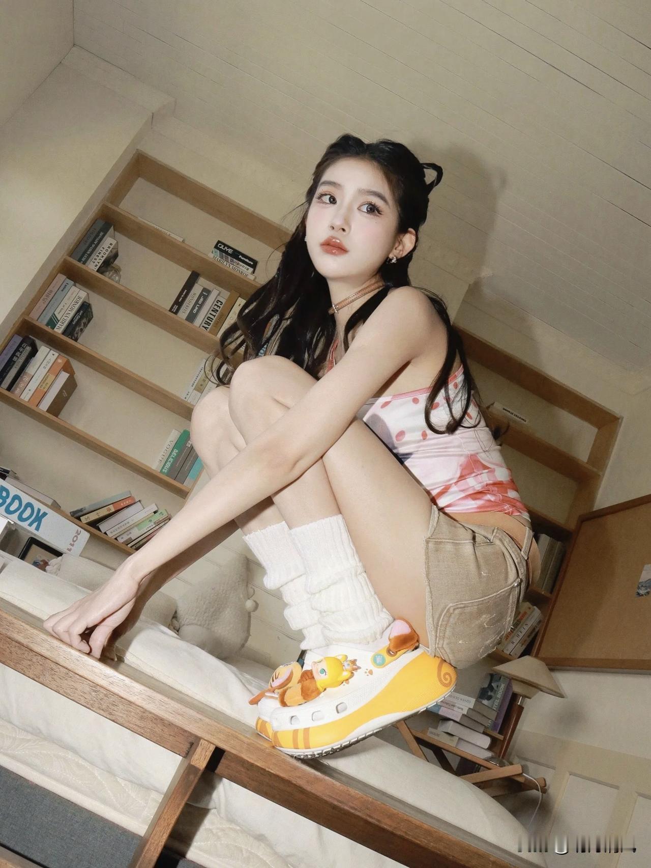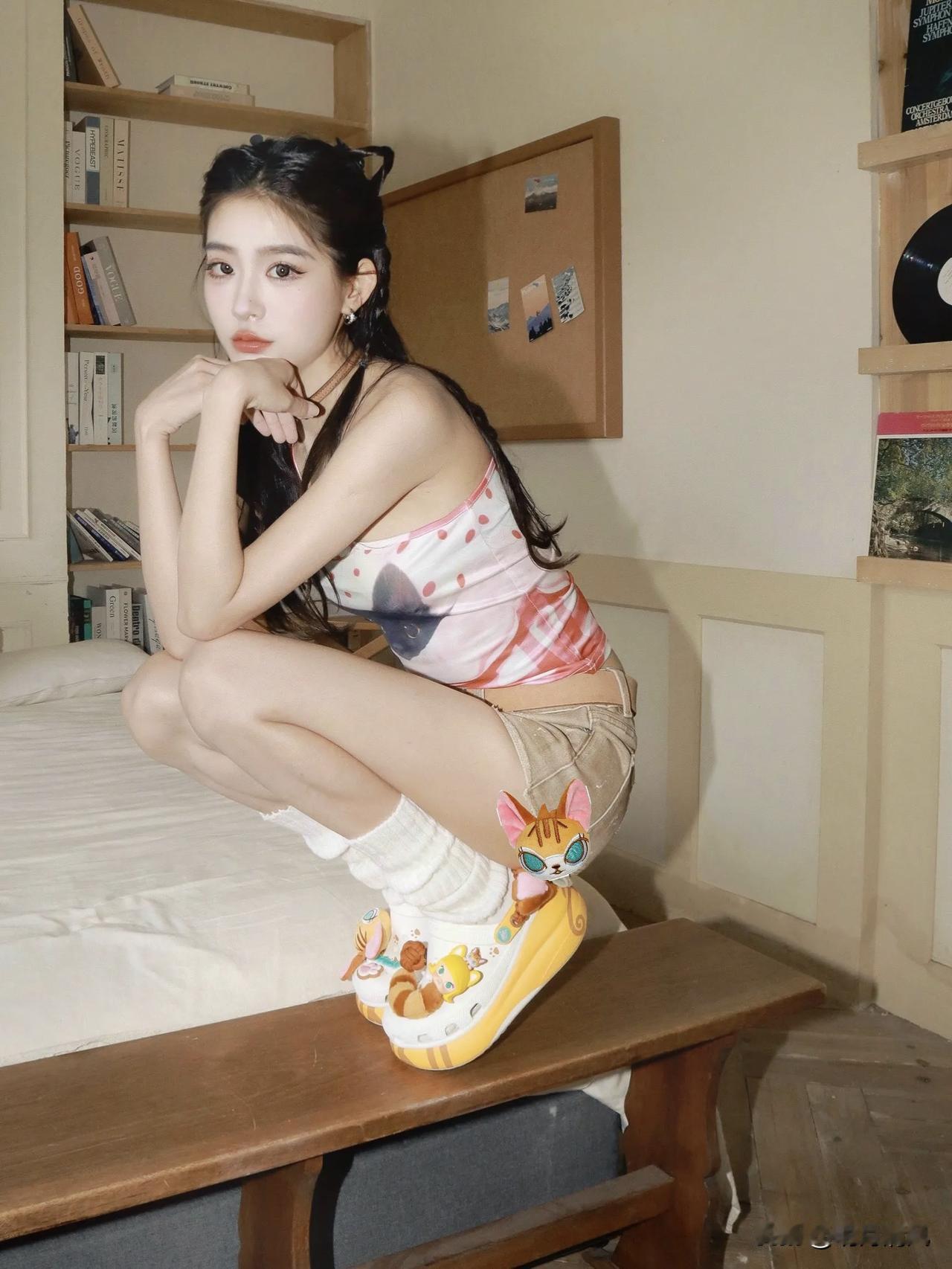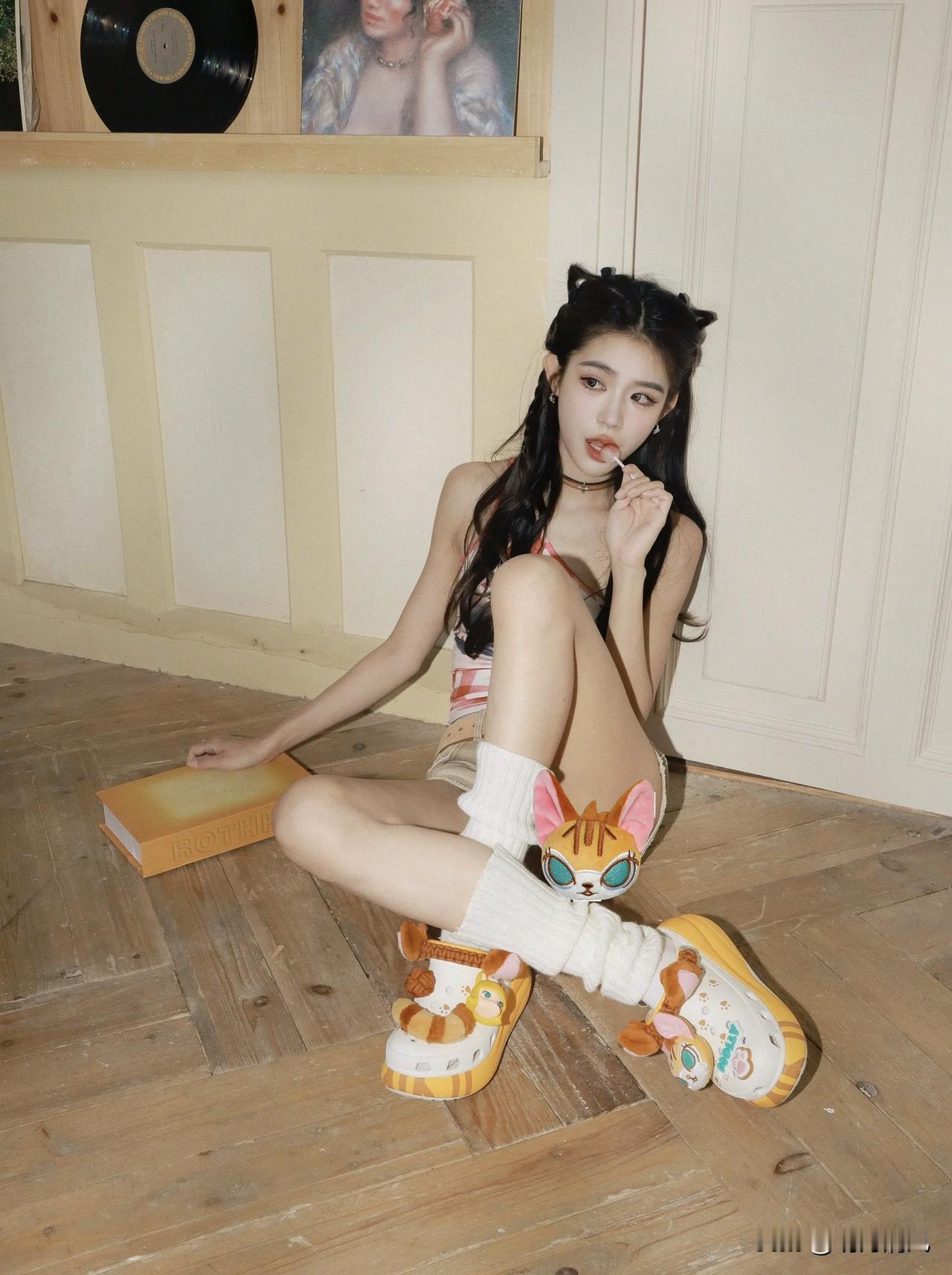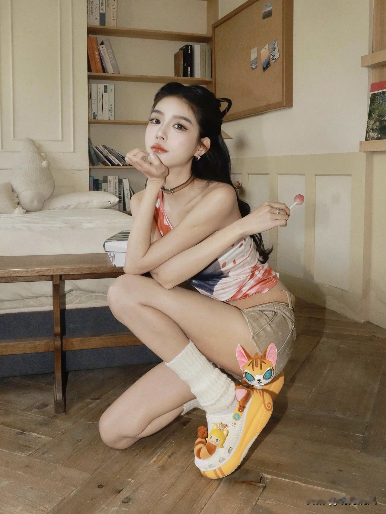 翻来覆去试了好几个角度,今天这组“猫系甜酷”我自己都忍不住多看几眼。斜肩印花背心+棒棒糖+奶橘厚底鞋,加上卧室那面奶油白墙和木书架,闪光灯一打,皮肤和猫耳发型全跳出来了。