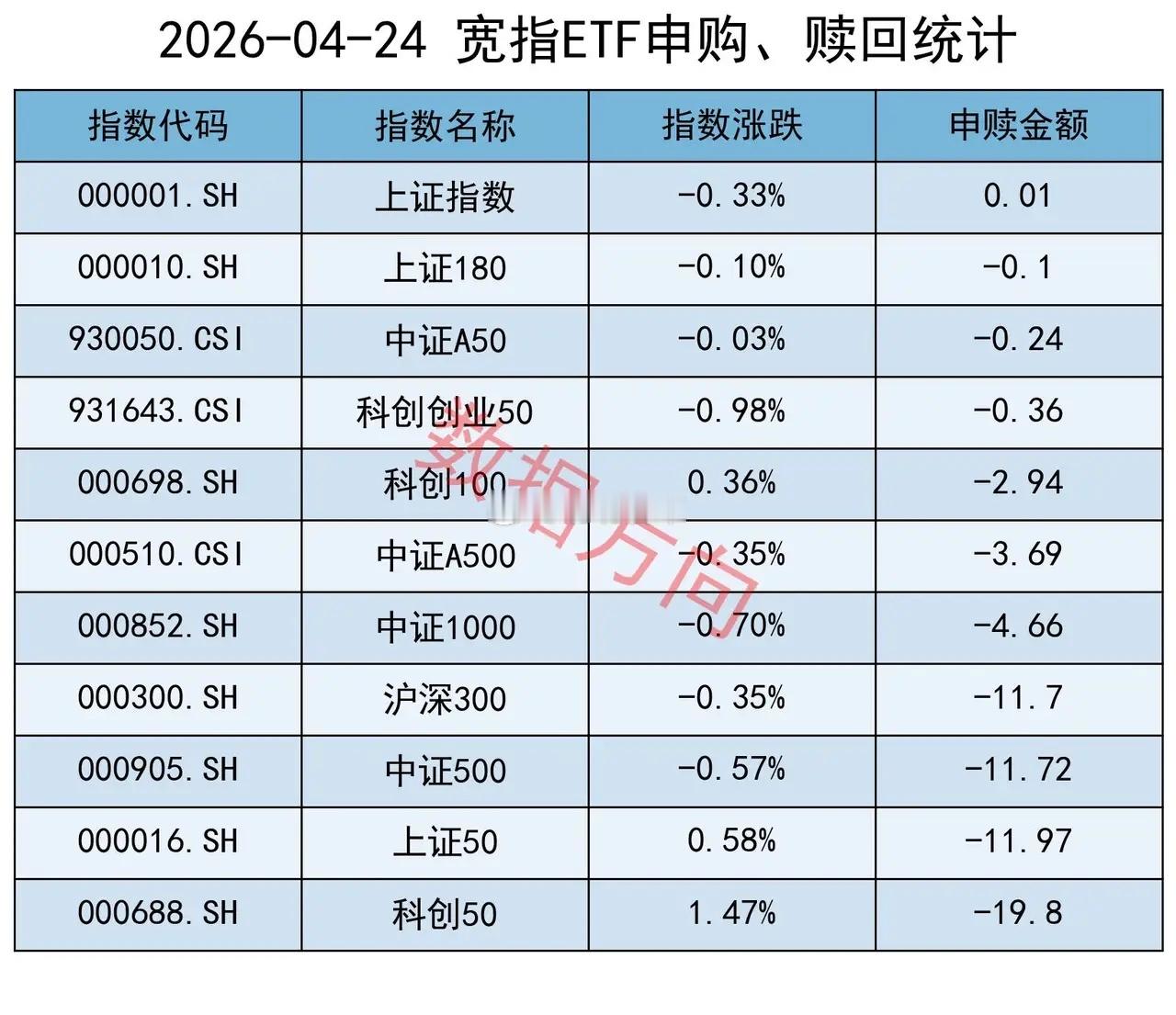 中证1000指数(-4.66亿)、中证A500指数(-3.69亿)、科创100指数(-2.94亿)、科创创业50指数(-0.36亿)、中证A50指数(-0.24亿)、上证180指数(-0.1亿),净赎回都在5亿之内。