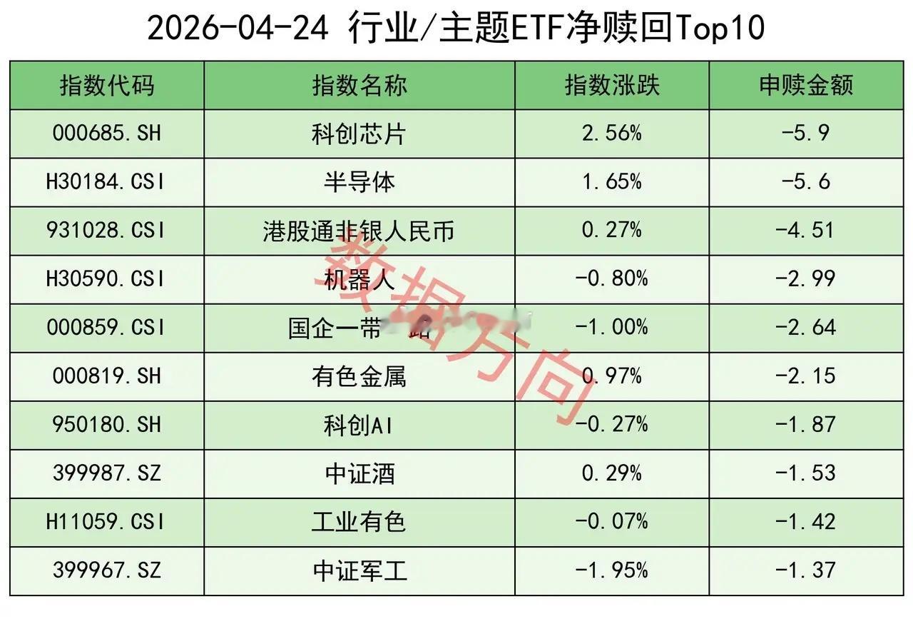 其他进入赎回榜的还有:港股通非银人民币指数(-4.51亿)、机器人指数(-2.99亿)、国企一带一路指数(-2.64亿)、有色金属指数(-2.15亿)、科创AI指数(-1.87亿)、中证酒指数(-1.53亿)、工业有色指数(-1.42亿)、中证军工指数(-1.37亿)。
