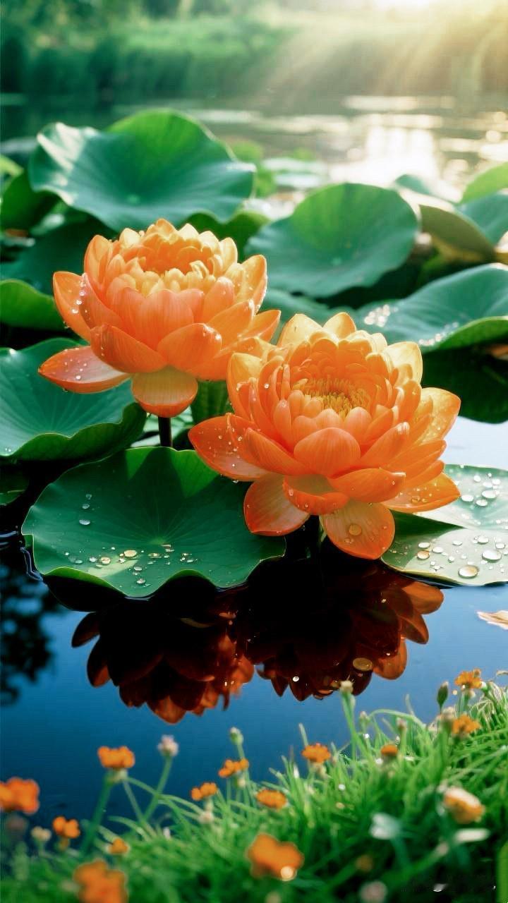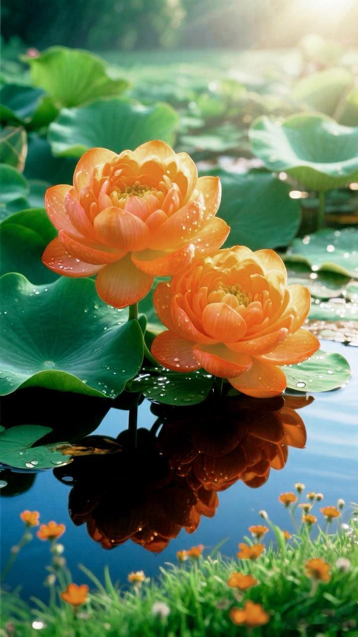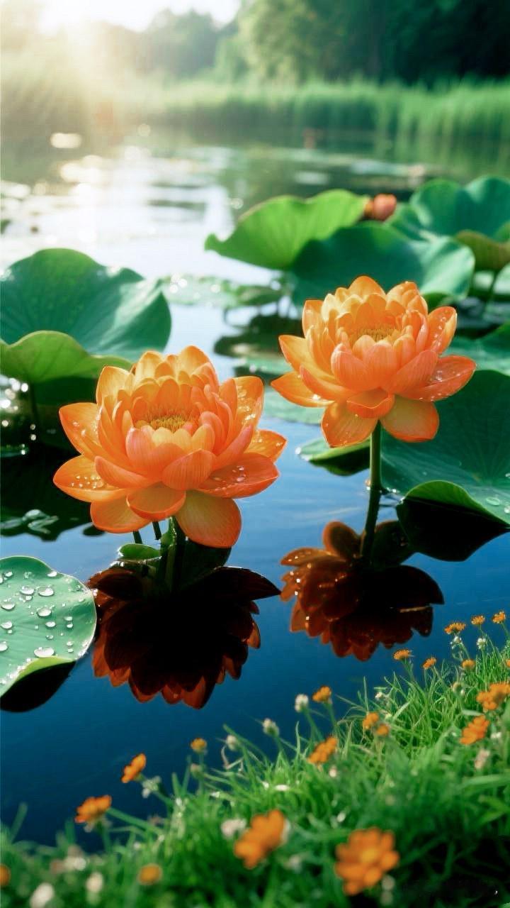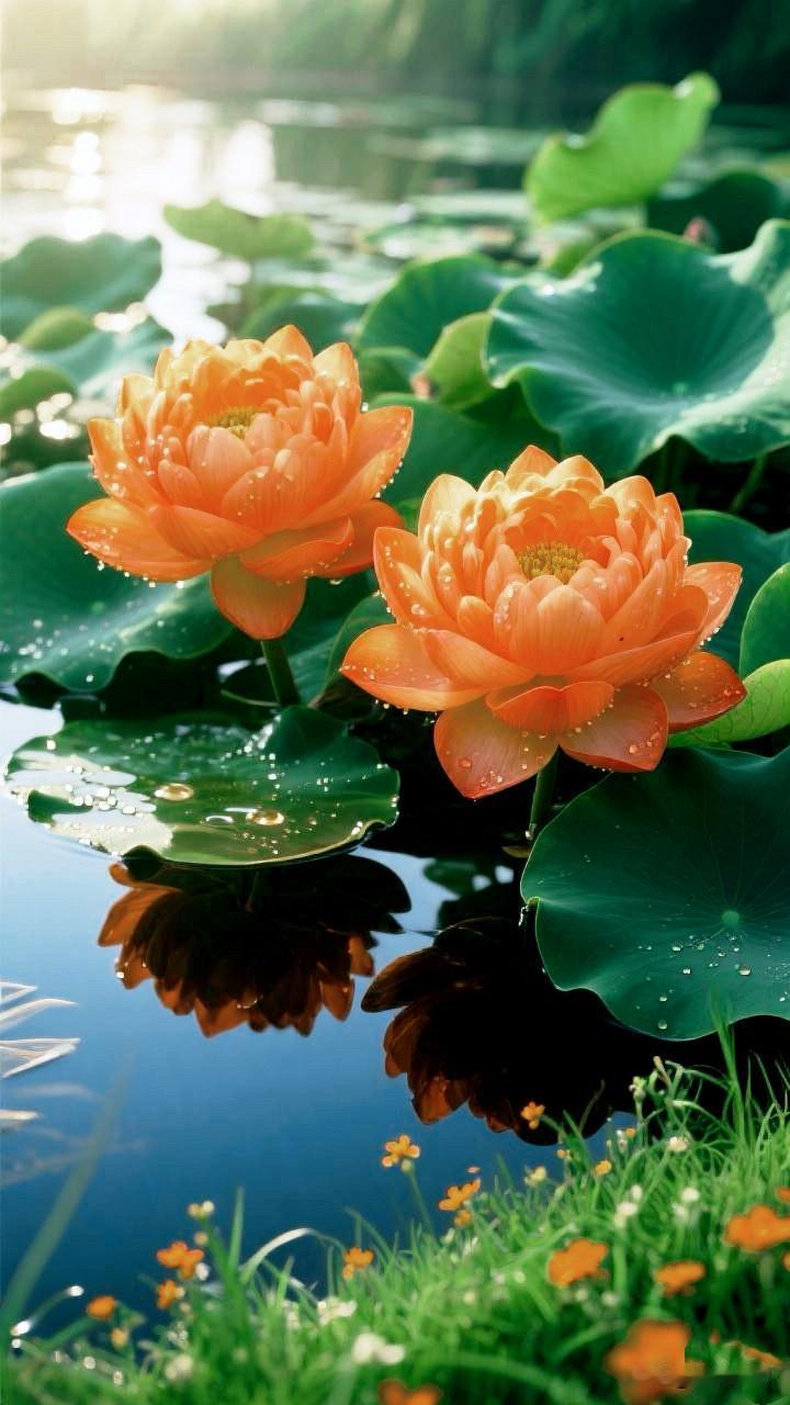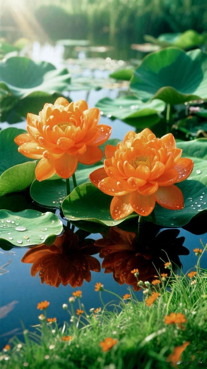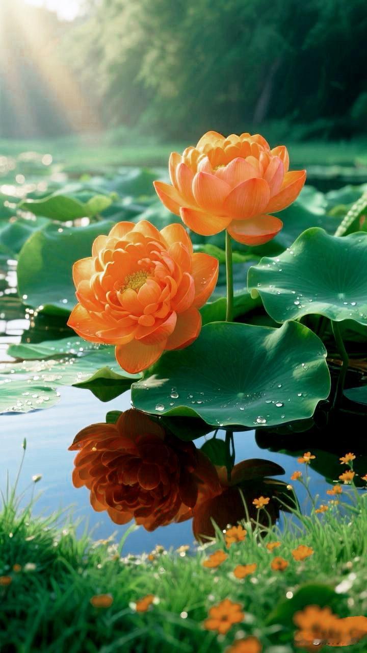 四月,看两朵橘莲依偎在水面,才懂,美好从不是孤芳自赏,而是光、露、叶、水,一起把平凡日子酿成诗。此刻,忽然觉得,生活,就像这荷花,哪怕扎根淤泥,也要朝着光的方向,把每一片花瓣都开成温柔的模样……[祈祷]