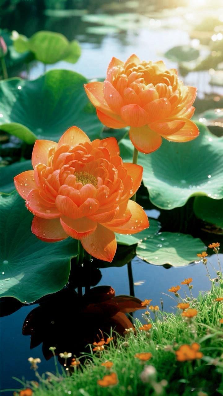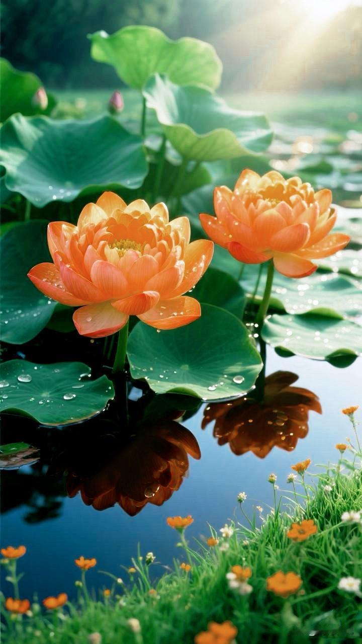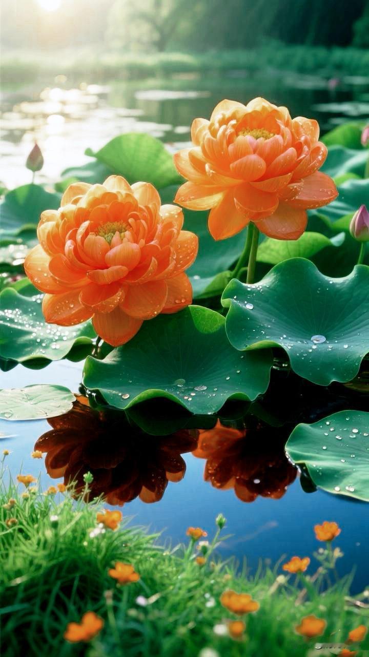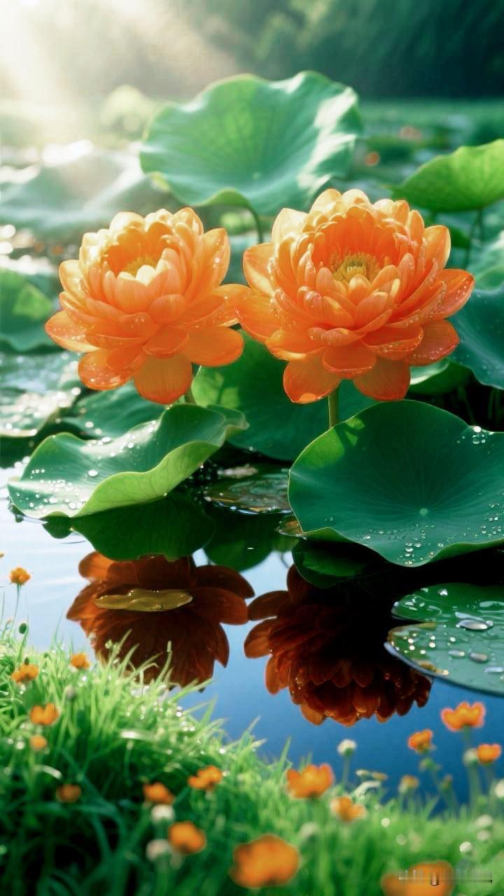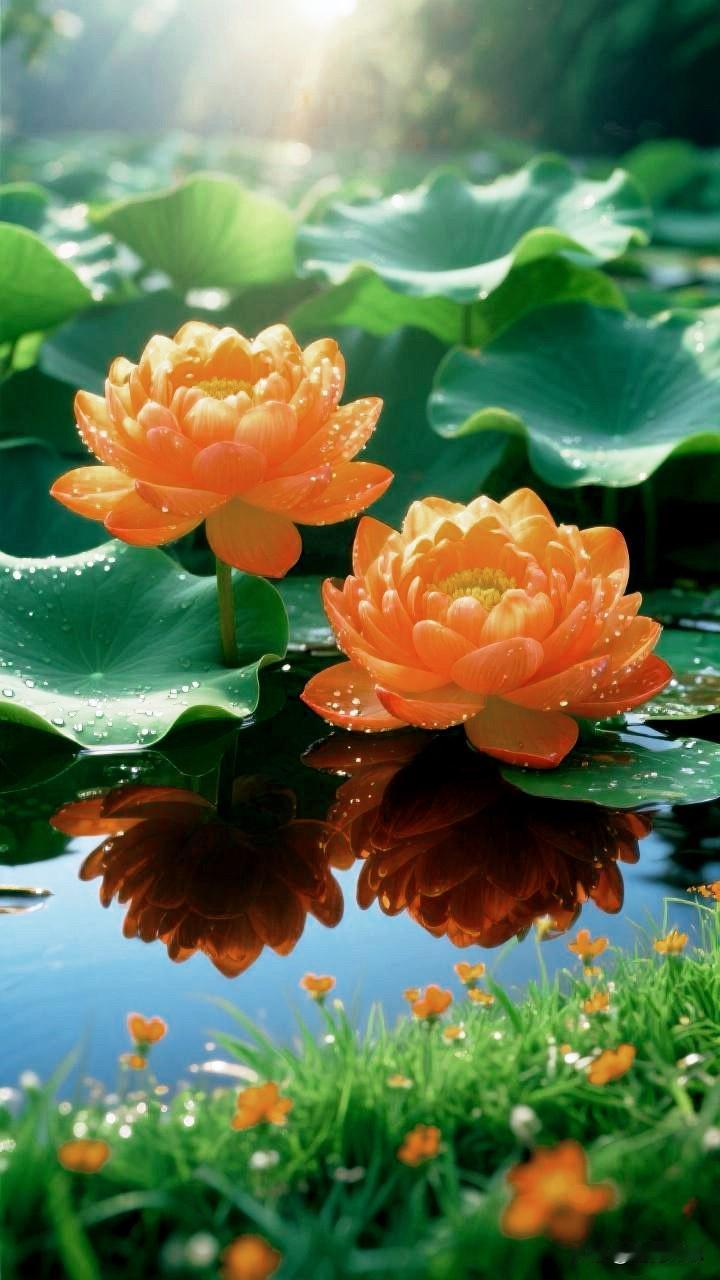 四月,看两朵橘莲依偎在水面,才懂,美好从不是孤芳自赏,而是光、露、叶、水,一起把平凡日子酿成诗。此刻,忽然觉得,生活,就像这荷花,哪怕扎根淤泥,也要朝着光的方向,把每一片花瓣都开成温柔的模样……[祈祷]