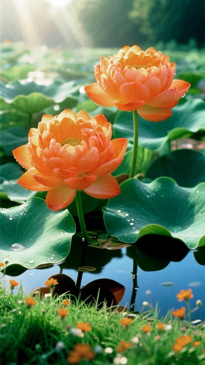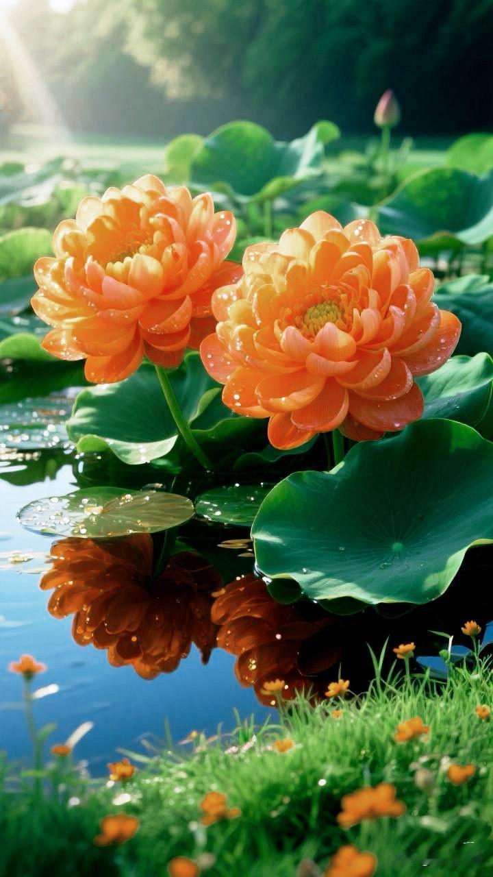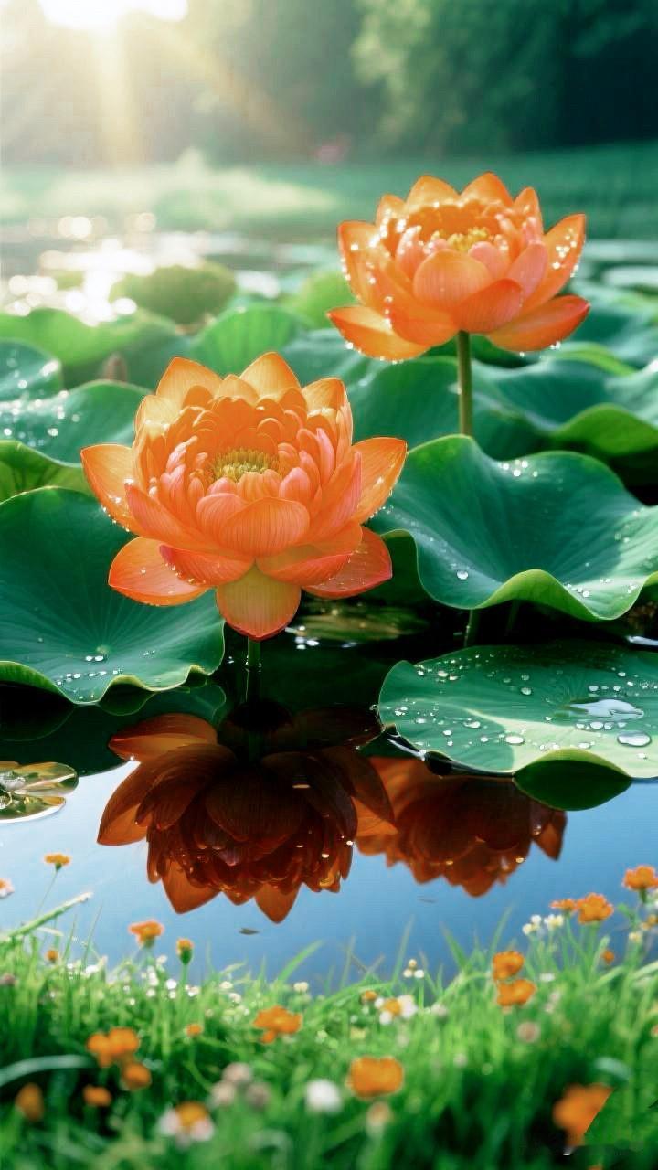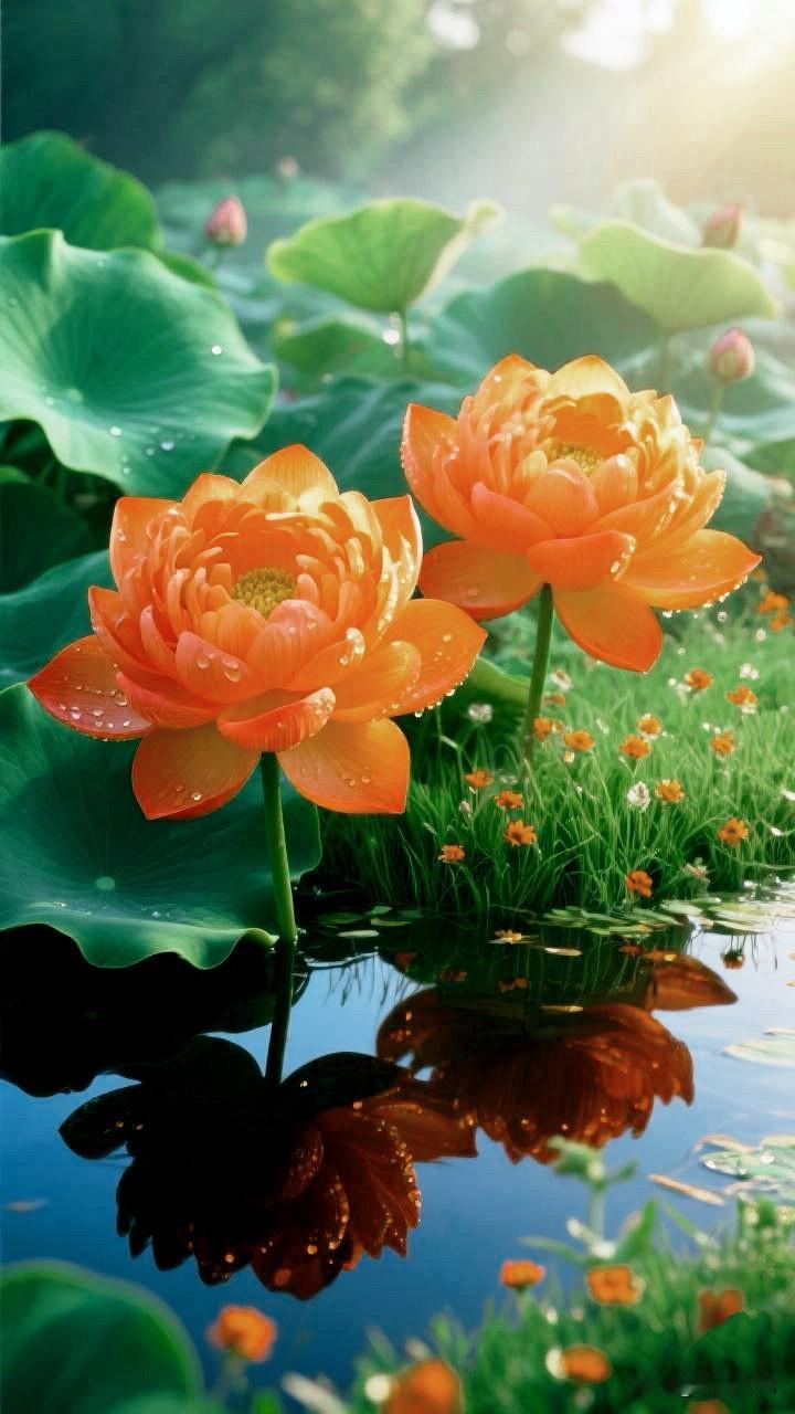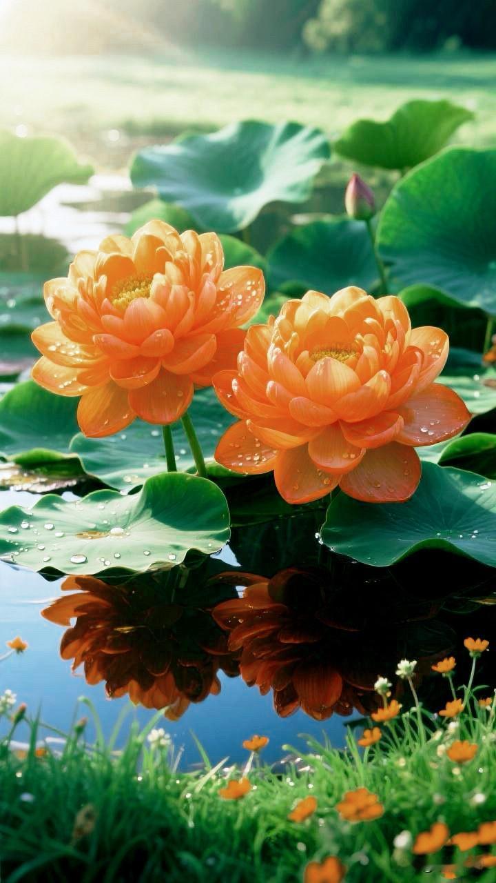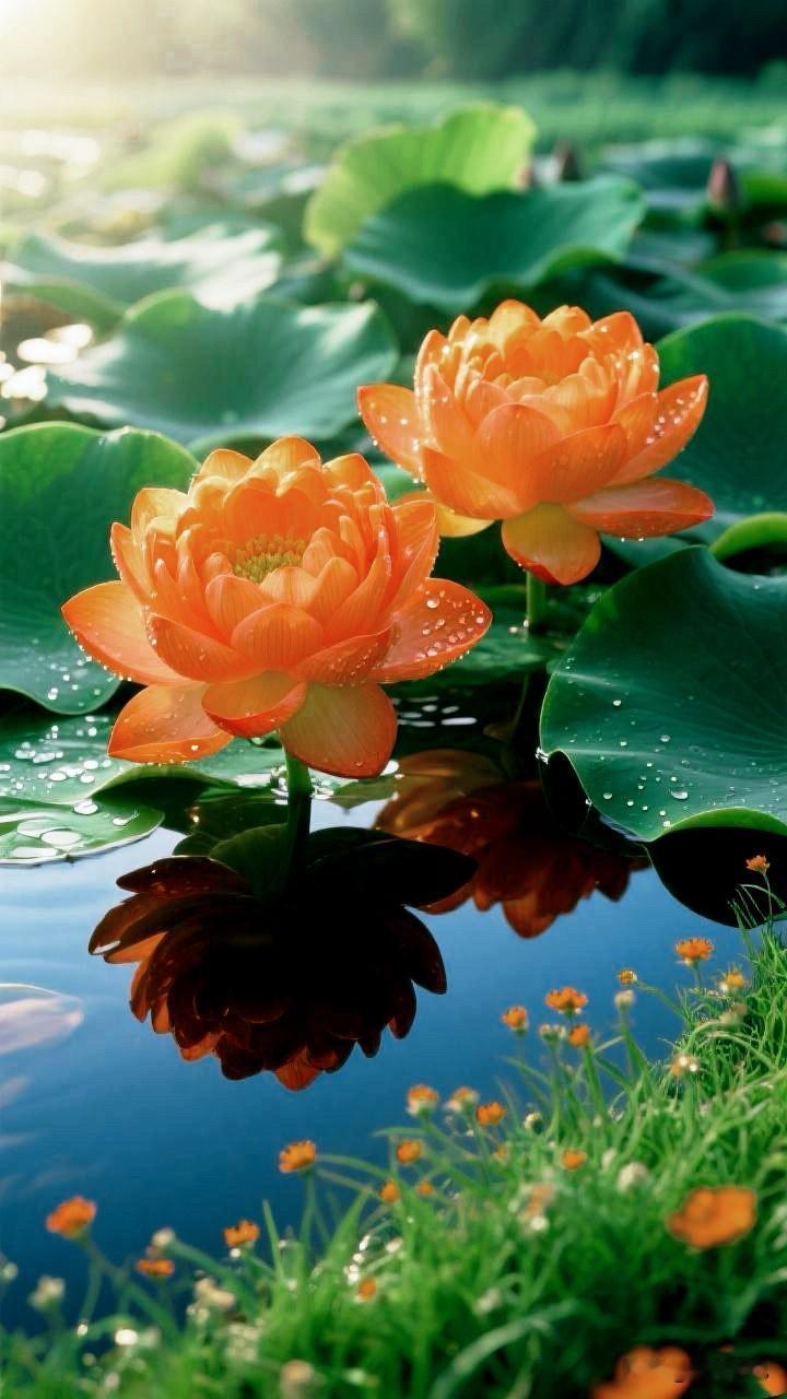四月,看两朵橘莲依偎在水面,才懂,美好从不是孤芳自赏,而是光、露、叶、水,一起把平凡日子酿成诗。此刻,忽然觉得,生活,就像这荷花,哪怕扎根淤泥,也要朝着光的方向,把每一片花瓣都开成温柔的模样……[祈祷]