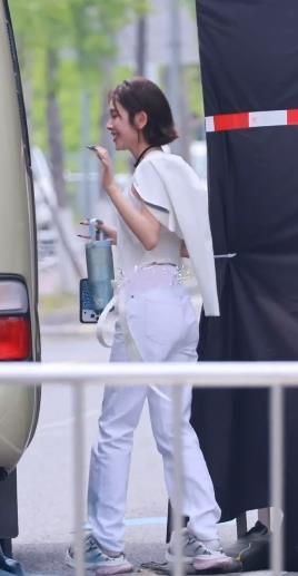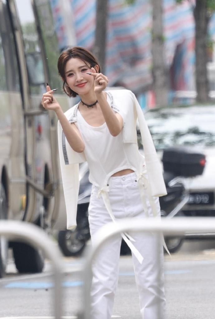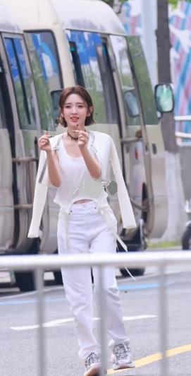 唐艺昕上身穿白色背心,下身搭配白色裤子,让她秀出纤细的腰部线条和完美的身材比例。