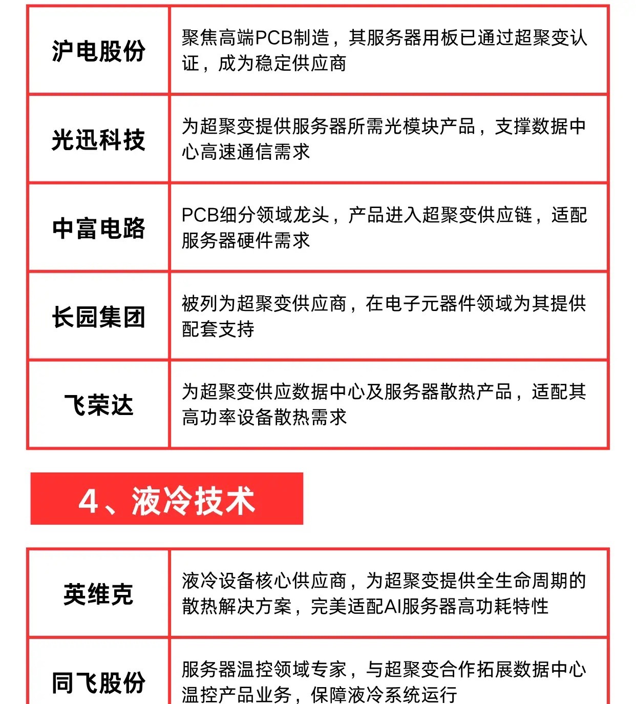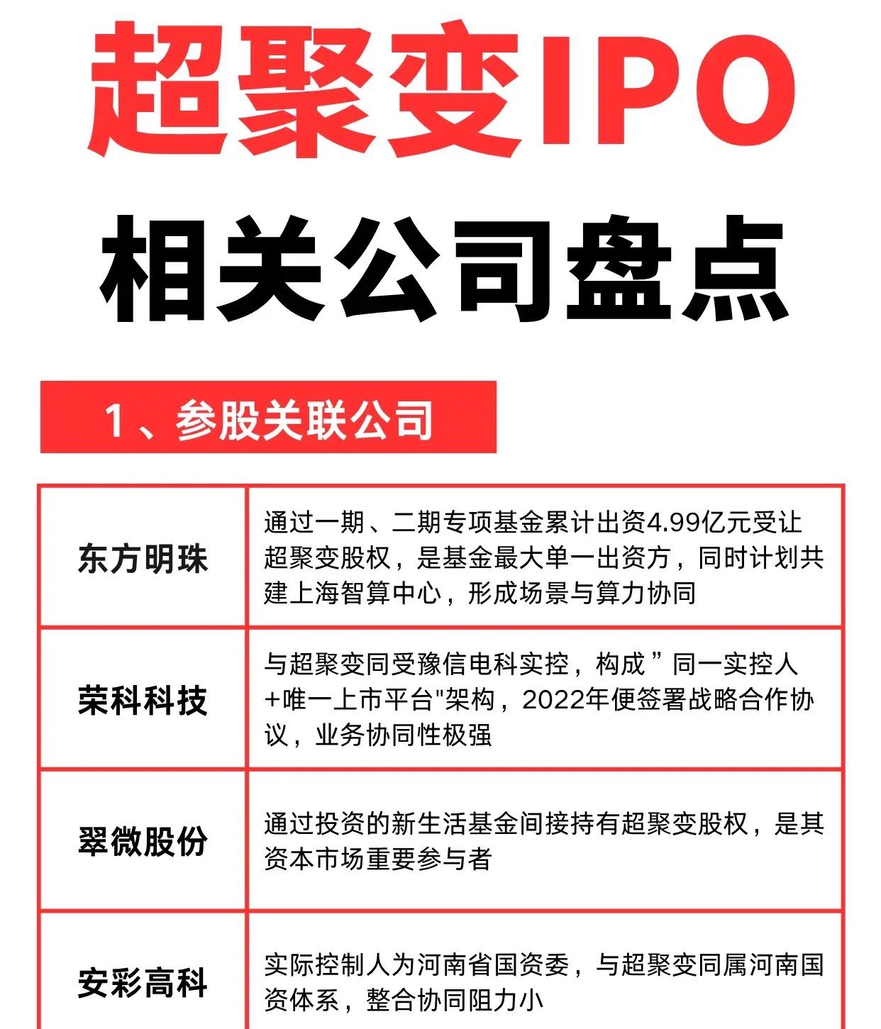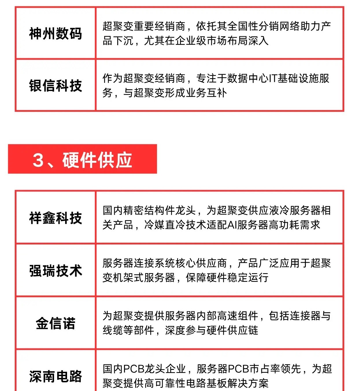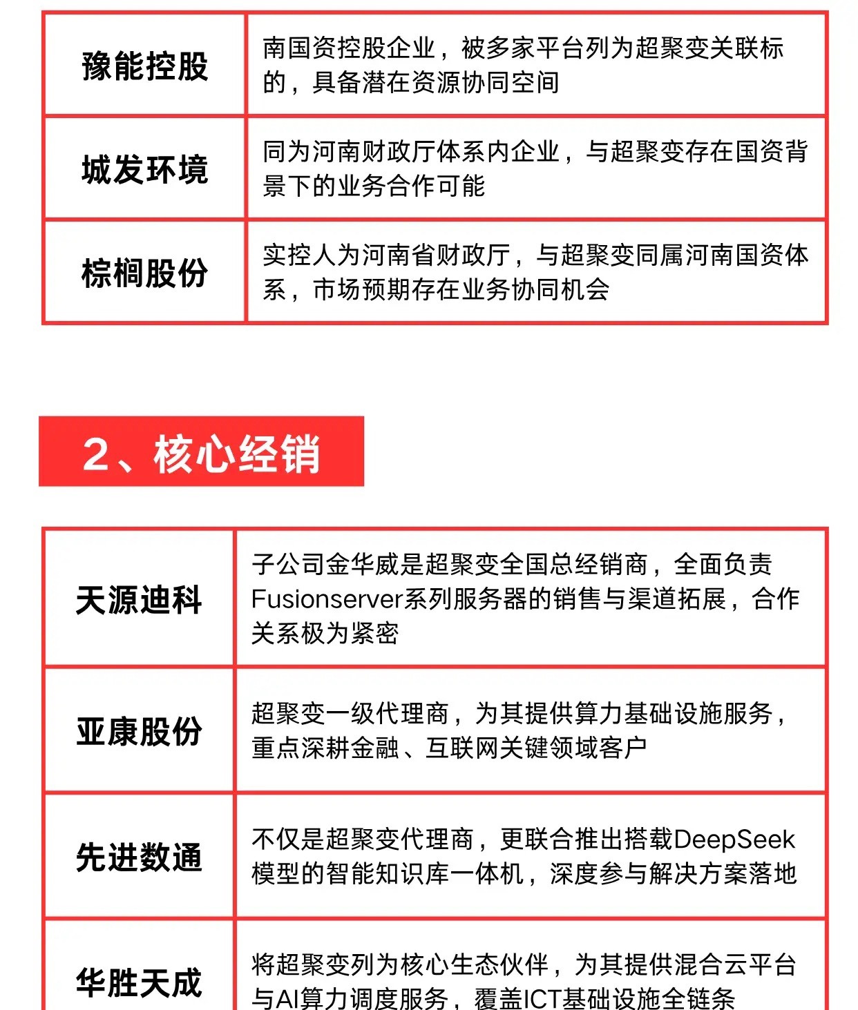 超聚变IPO要来!最全产业链受益名单梳理🔥算力巨头超聚变IPO预期持续升温,整条产业链的参股、经销、合作标的彻底浮出水面,谁是真深度绑定,谁是纯蹭热度,一眼看清!🟢 间接参股标的翠微股份、塔牌集团、东方明珠,均通过不同主体间接布局超聚变,直接分享上市股权红利🟡 国资系核心阵营豫信电科:旗下唯一上市平台荣科科技豫能控股、城发环境、安彩高科、棕榈股份:河南本土国资控股企业,深度关联超聚变大股东背景🔵 官方经销商梯队- 总经销商:神州数码、天源迪科,渠道权重最高,优先受益出货放量- 铂金/金牌经销商:荣科科技、嘉环科技、先进数通,官方认证核心合作- 一级代理商:亚康股份、银信科技、开勒股份,全渠道深度覆盖🟣 深度产业链合作伙伴- 温控散热:英维克、强瑞技术,直接为超聚变算力设备提供液冷、散热核心配套- 战略绑定:海峡创新、软通动力、天玑科技,签署深度战略合作,全场景协同温馨提示:仅为题材梳理,不构成任何投资建议