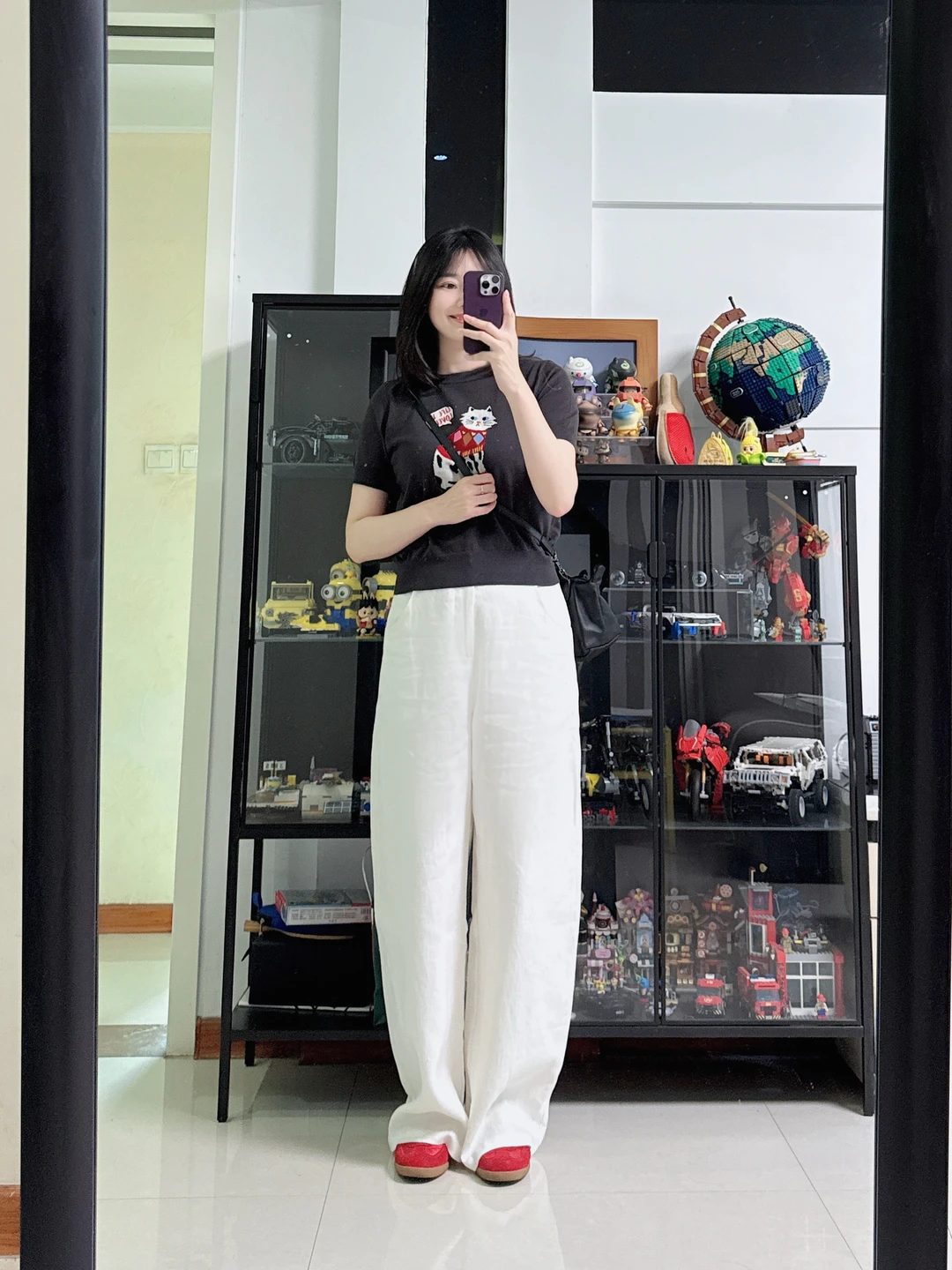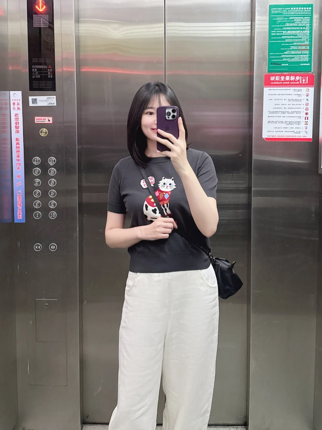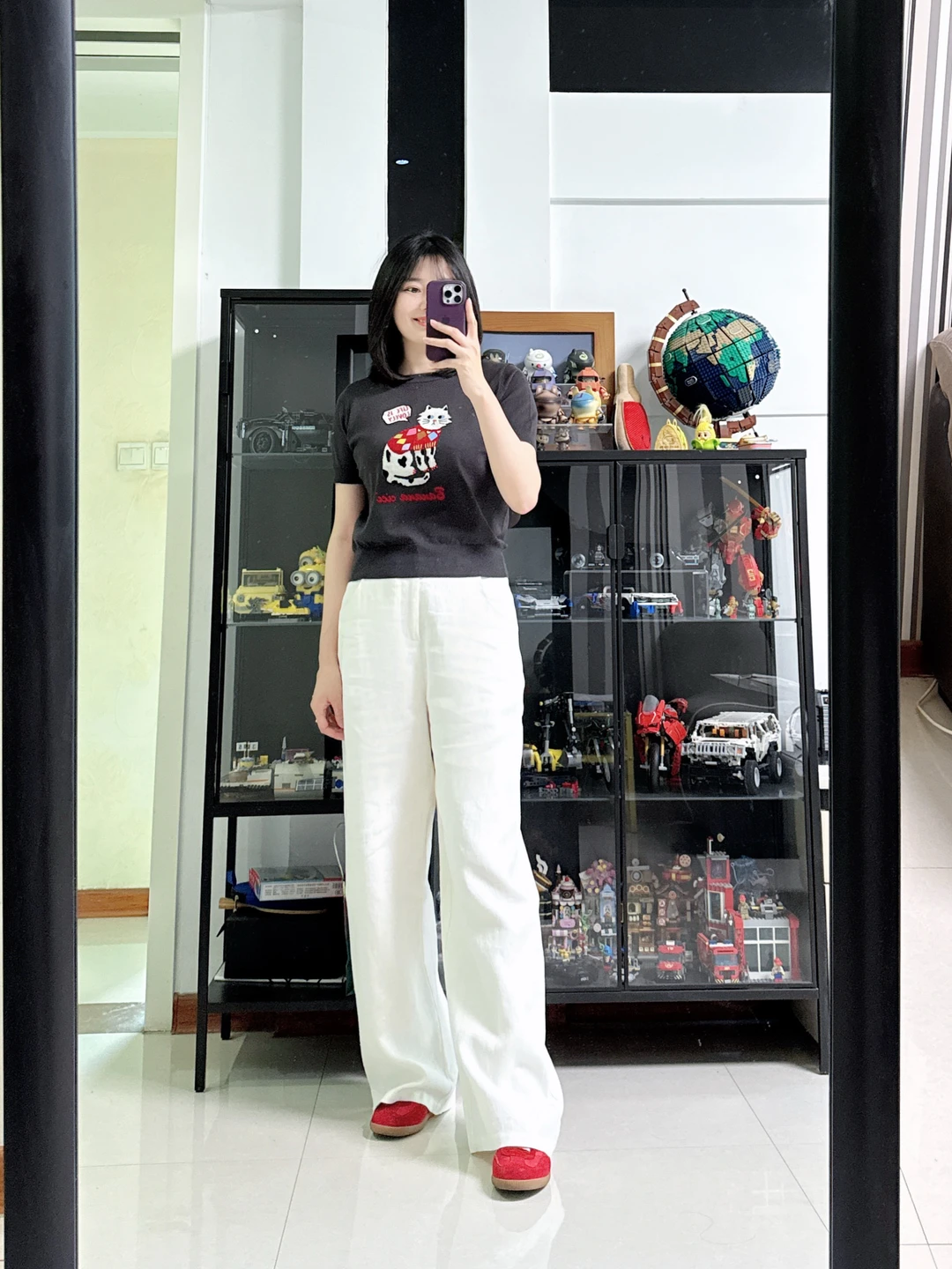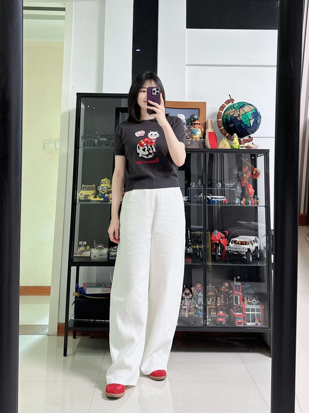 灰色针织短袖,搭配白色阔腿裤,松弛里面一点小俏皮,日常休闲穿舒适好看的一套