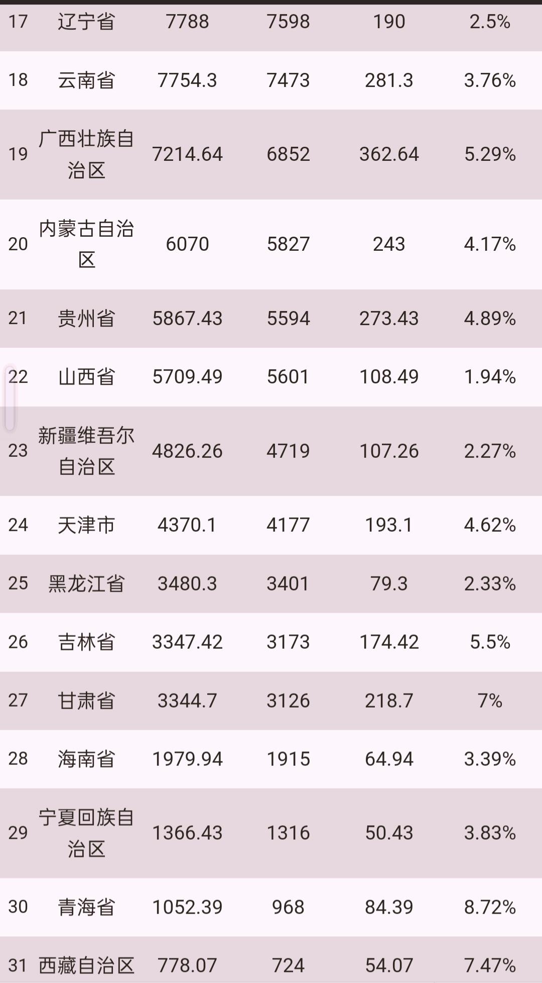 湖南与安徽、江西与陕西、吉林与甘肃总量几乎相等。