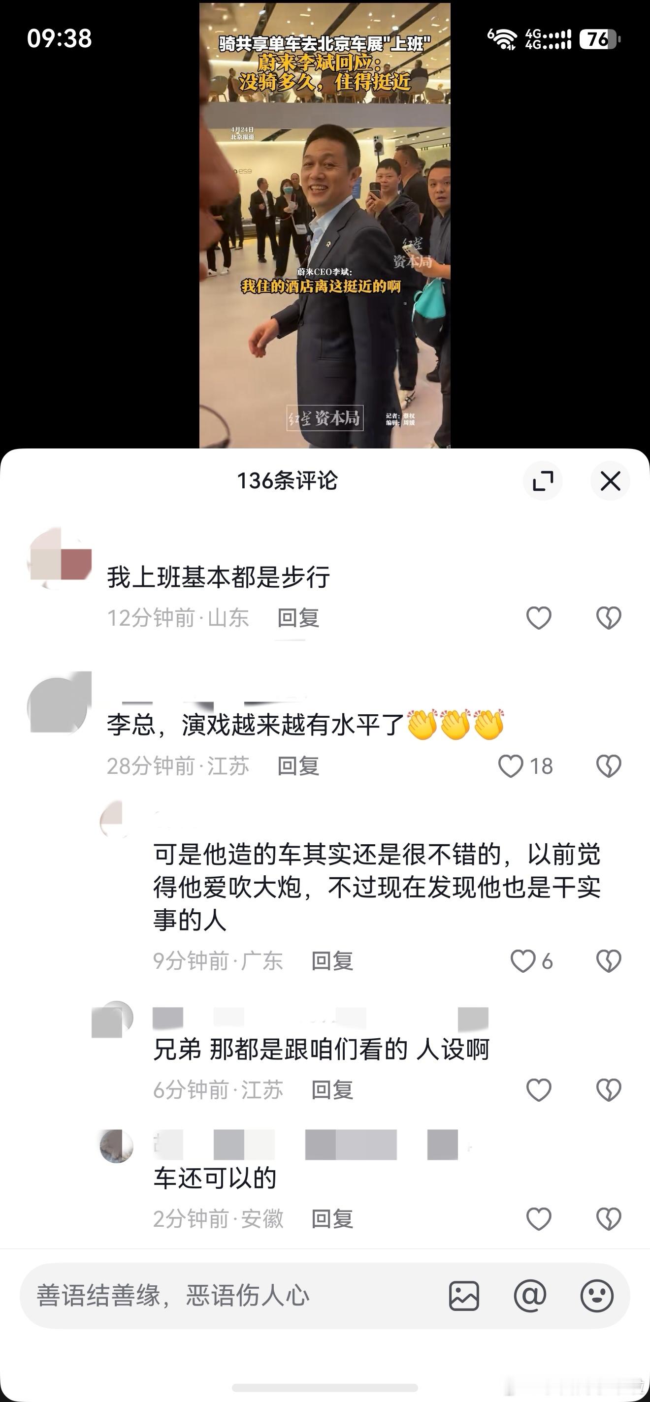 昨天北京车展 ,刷到有人发李斌骑自行车去现场,评论区有人喷李斌作秀、演戏。