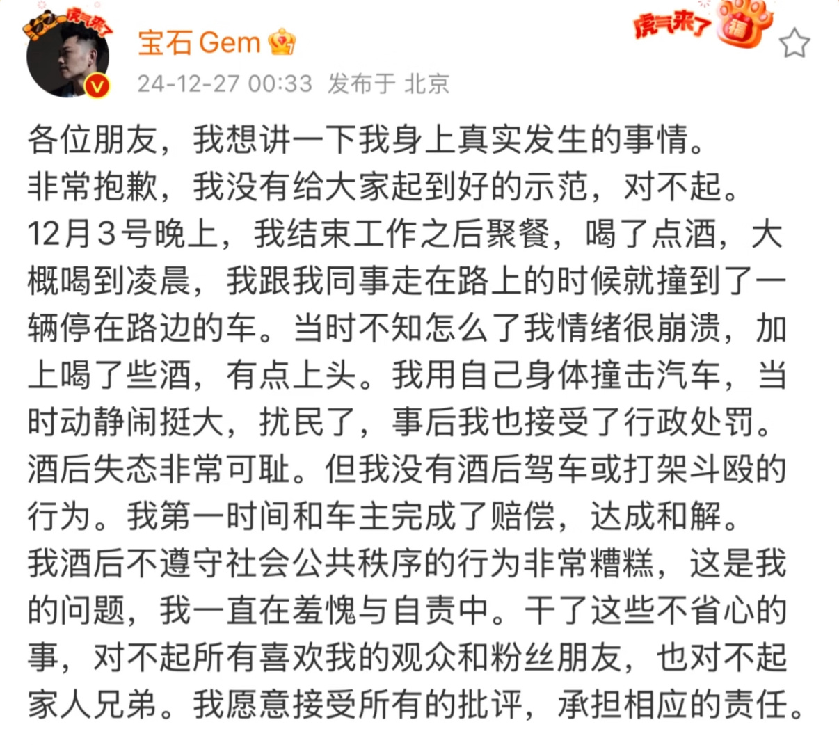 24.12.27老舅发文道歉,承认酒后失态、接受处罚并赔偿车主。节目组以“犯错需沉淀反省”为由让其下车《五哈》第五季录制。