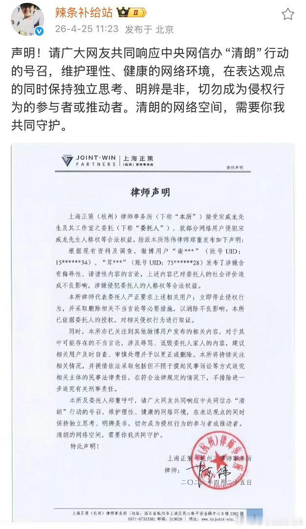 宋威龙宋威龙工作室律师声明 swl宋威龙 支持宋威龙维权,网络不是法外之地,请对
