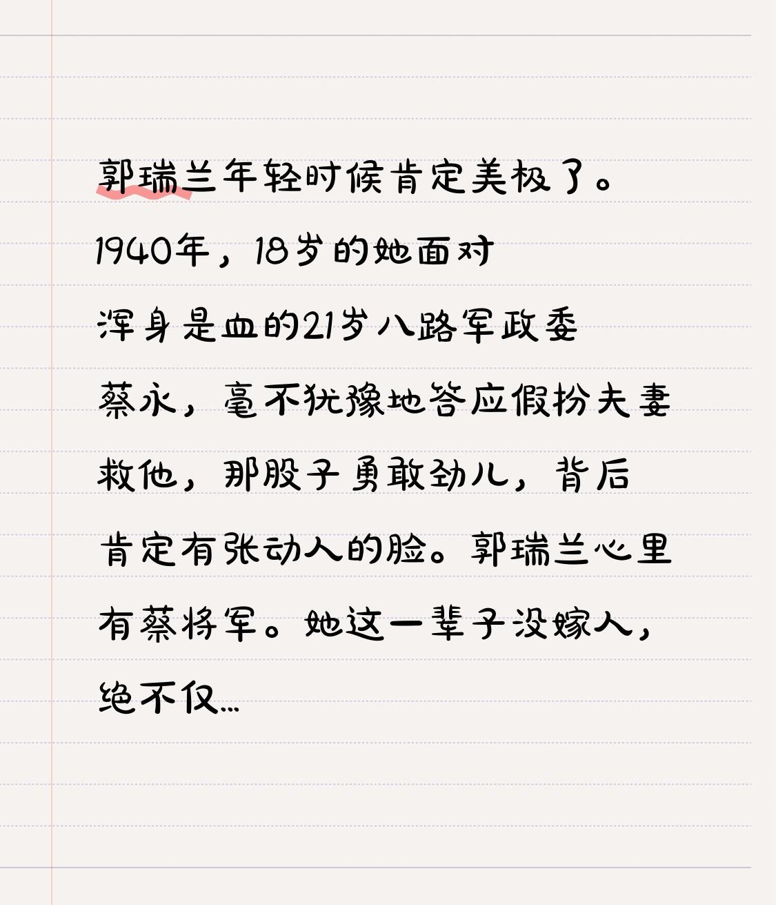 郭瑞兰年轻时候肯定美极了。1940年,18岁的她面对浑身是血的21岁八路军政委蔡永,毫不犹豫地答应假扮夫妻救他,那股子勇敢劲儿,背后肯定有张动人的脸。