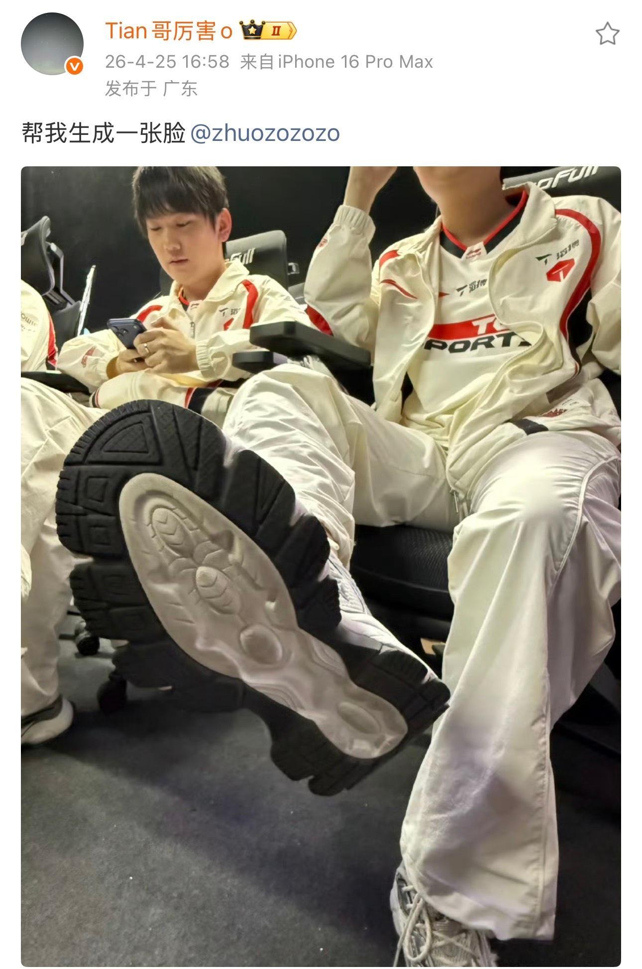 Tian赛后发鞋底照 Tian赛后社媒发鞋底照:帮我生成一张脸,并且艾特卓哥