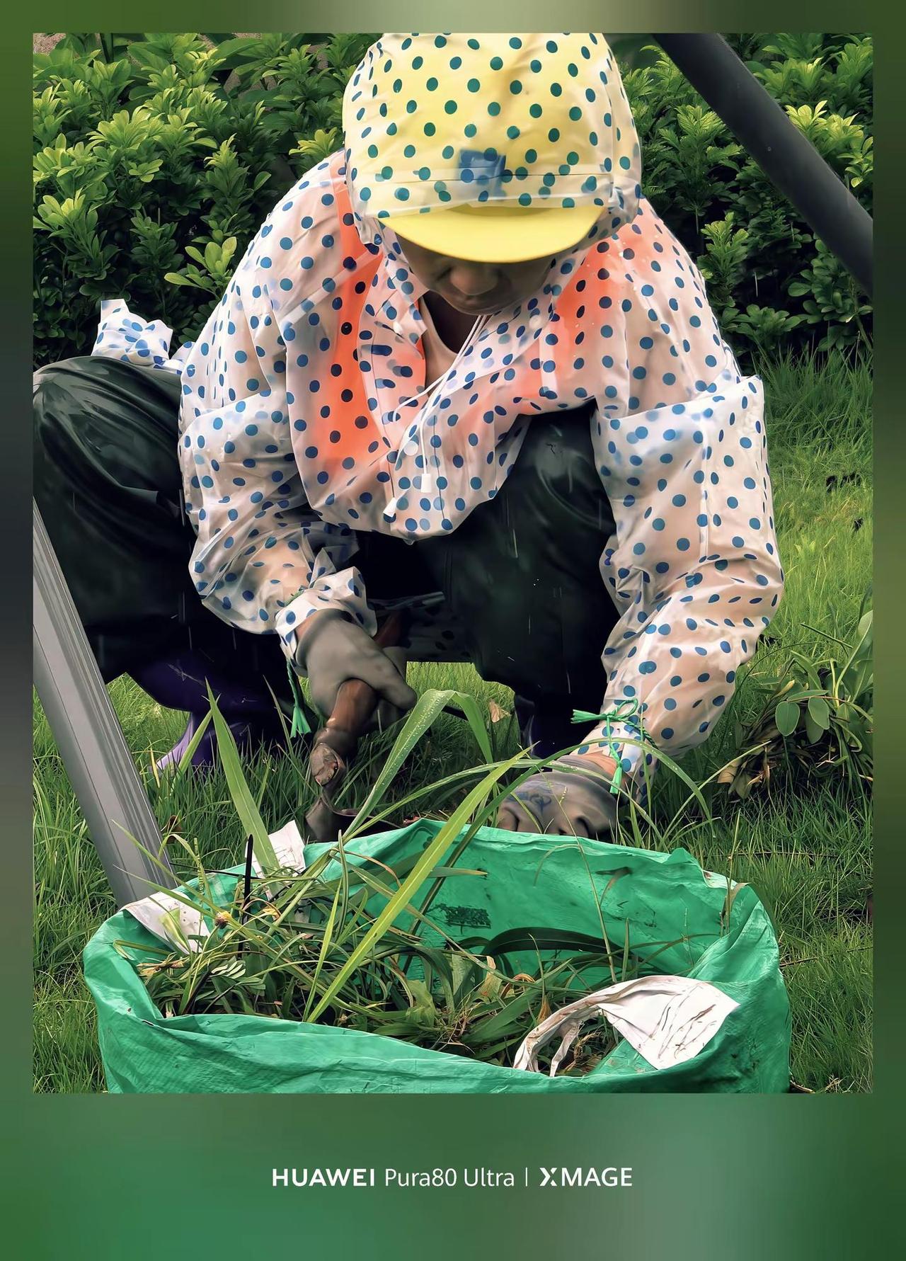 Pura80ultra XMAGE影像。2026华为影像大赛华为影像XMAGE花粉影像4-5月征稿地铁口旁大姐俏,雨衣可爱映大姐。草地湿意膝落地,左手镰刀右手草。雨天身影藏坚韧,人间点滴韵中留。捕捉悦动的生命力 2026华为影像大赛 华为影像XMAGE