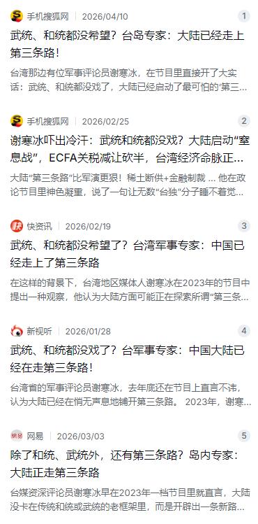 谢寒冰这人在台湾媒体圈摸爬滚打了几十年,从中时电子报的经理到旺报的网络总监,现在还当着中天新闻台的评论员,说话分量不轻。他最早在2023年的节目里就提出过这个判断,当时很多人还没太当回事。到了2026年,他把话说得更直白了:大陆既不走战争的路子,也不干等和平谈判,而是在走第三条路——“逼统”。