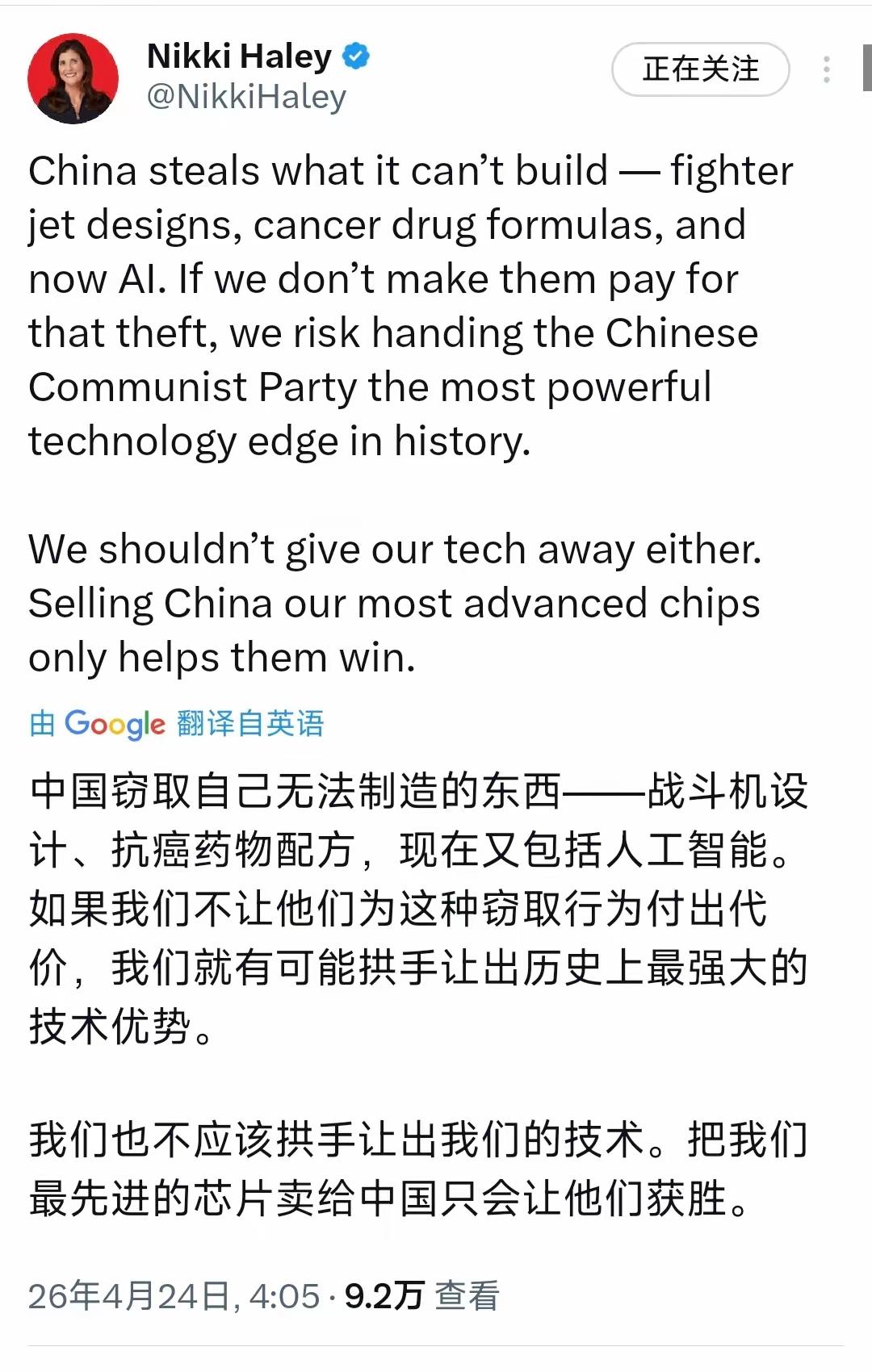 她原话是这么说的:中国专门偷自己造不出来的东西,比如战斗机设计、抗癌药配方,现在连人工智能也偷。还放狠话,说要是不让中国为这种“偷窃”付出代价,美国就会拱手让出最强大的技术优势,甚至警告不能把最先进的芯片卖给中国,不然中国就会“获胜”。