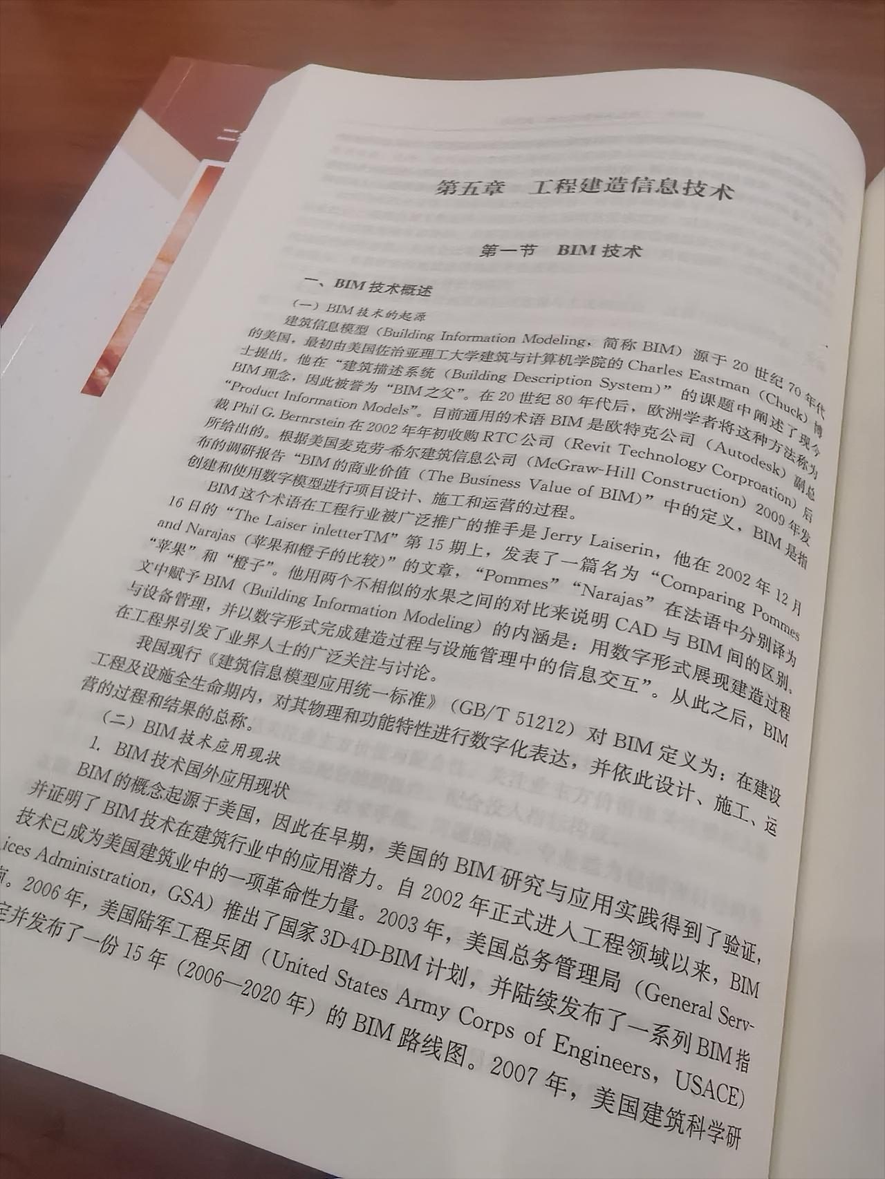 再说说BIM技术,整本教材我感觉都是被西方翻译过来的东西,没有一点国内的自己思想在里面,我们在工地上用的最大的就是在PPT上吹点牛逼,或者说和别人吹牛逼的时候多一点谈资,其实这东西是很费钱的,没有专业的人员要委托社会上第三方去做模型去维护。到头来在工地上最大的东西就是挂在墙上的模型和防碰撞方案。