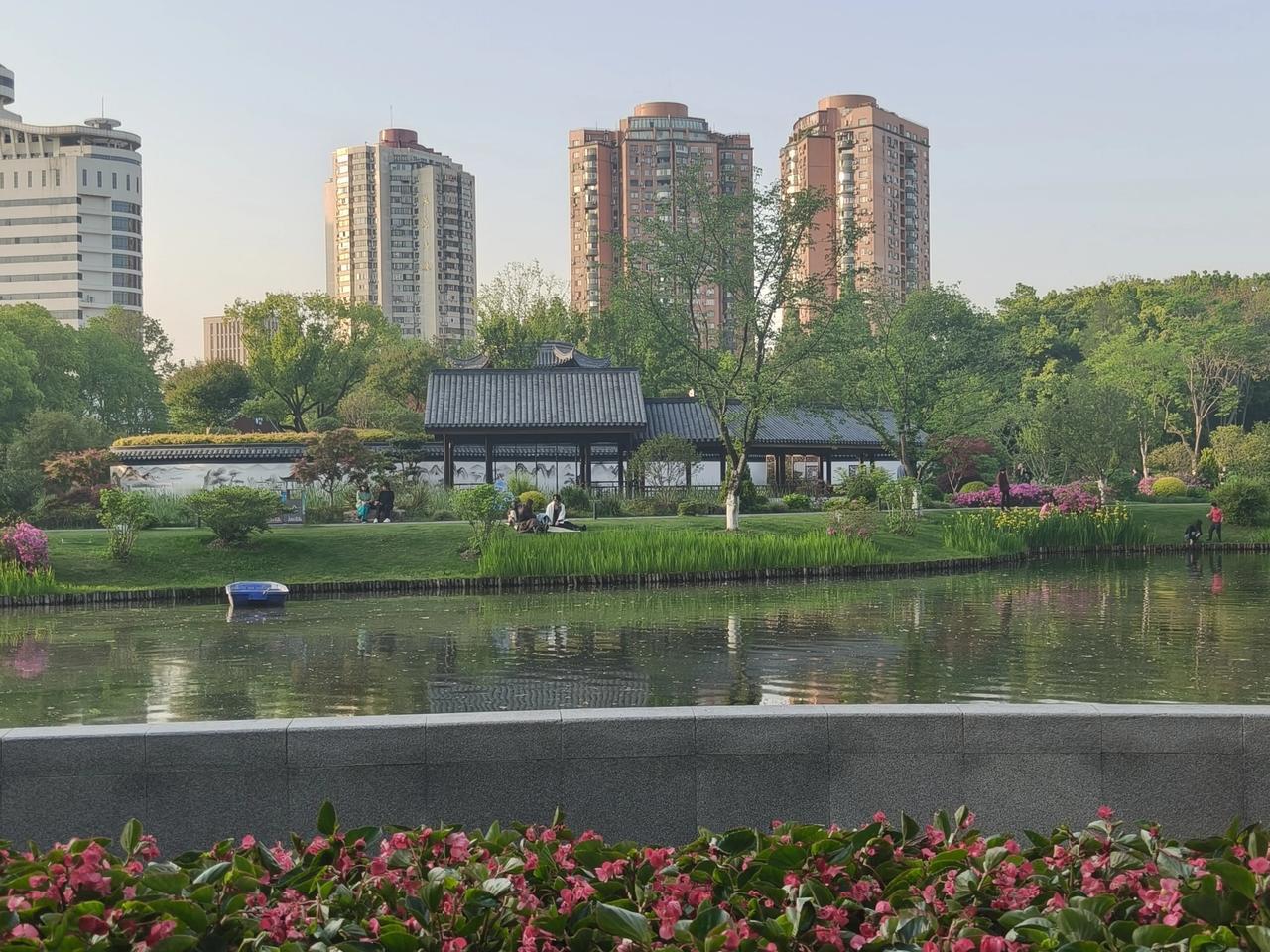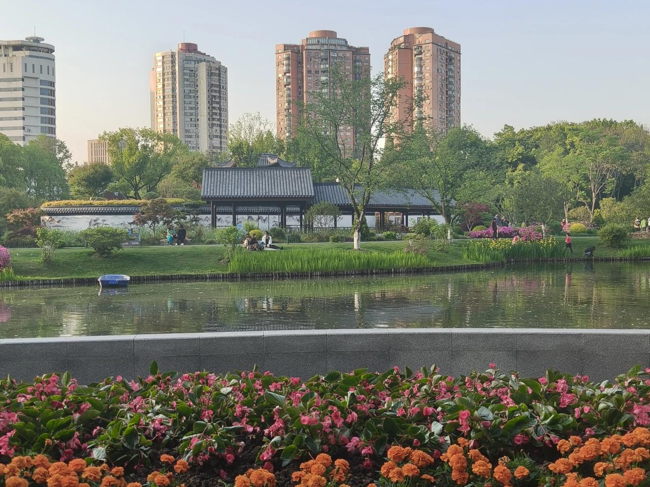 春光旖旎入公园,万紫千红景色妍。碧水悠悠映花影,青山隐隐绕云烟。莺啼燕语