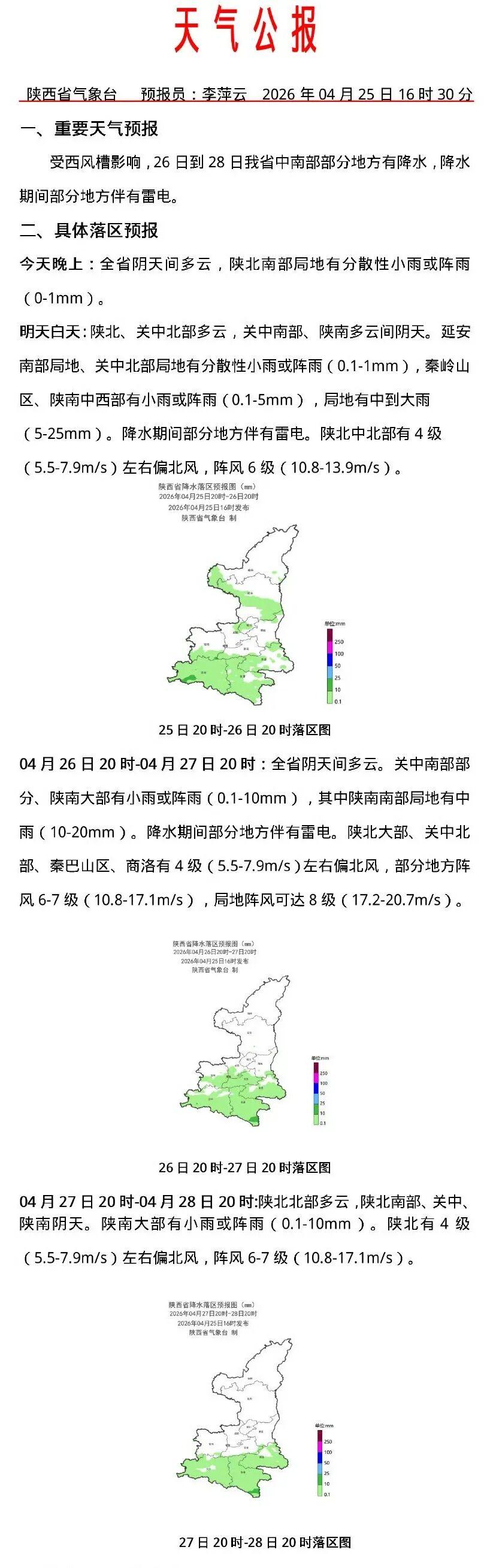 据陕西省气象台4月25日16时30分发布天气公报,受西风槽影响,26日到28日陕西省中南部部分地方有降水,降水期间部分地方伴有雷电。