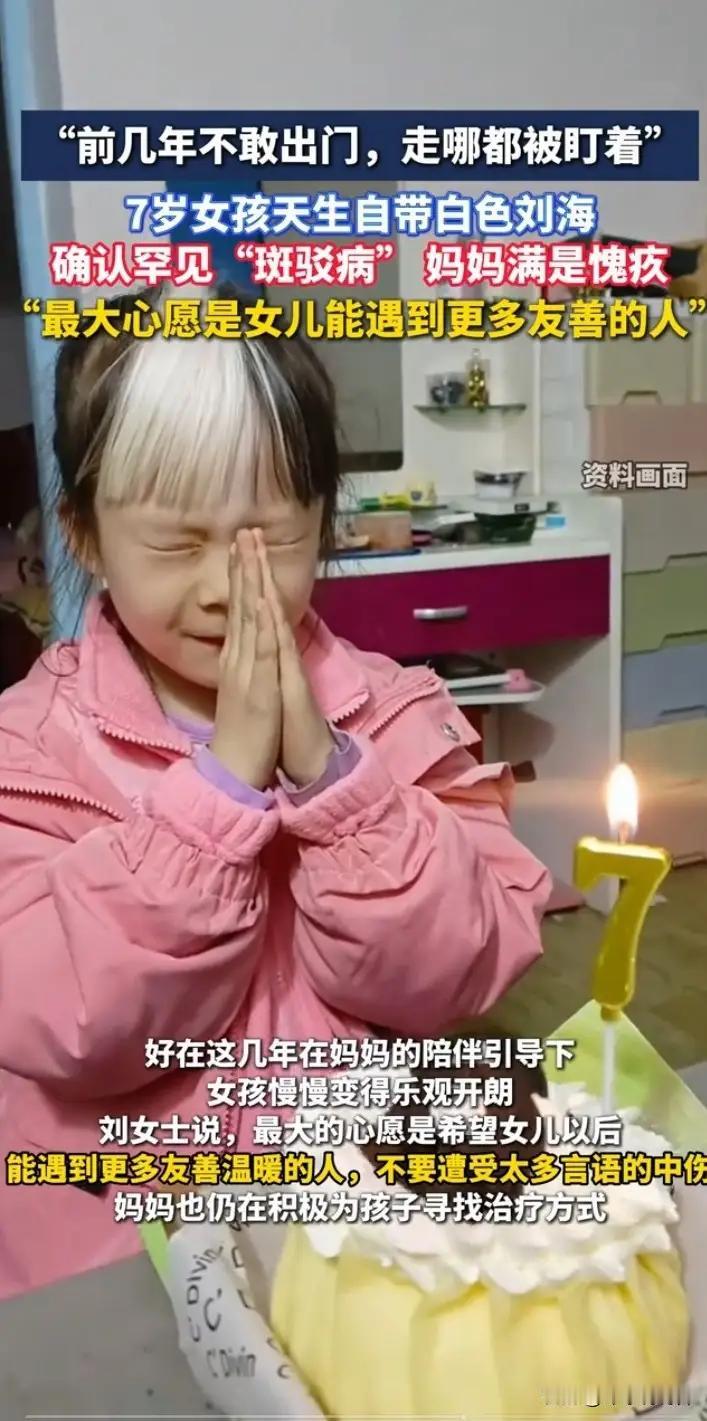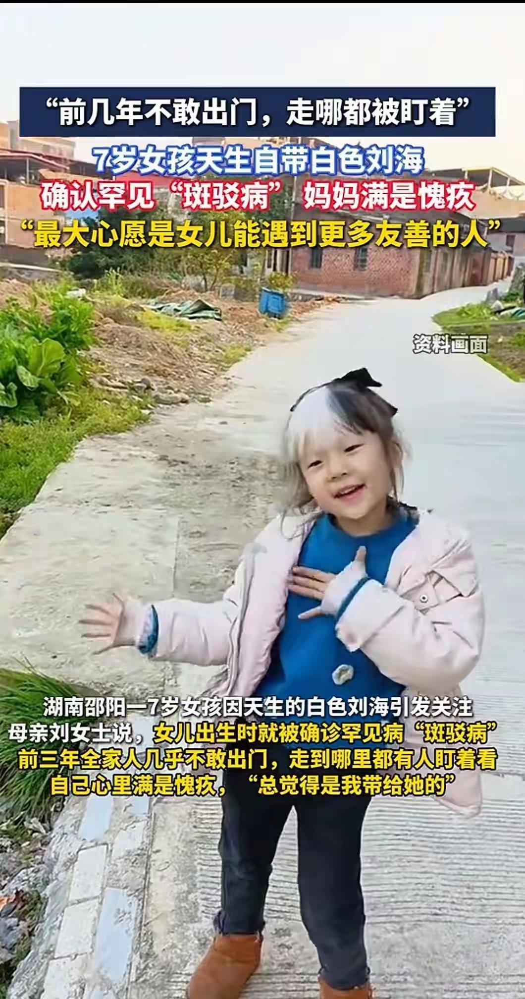 湖南邵阳一名7岁女孩,出生就带一撮整齐的白色刘海,近日被正式确诊为斑驳病(Piebaldism)——一种罕见的先天性遗传病,俗称“白点病”或“斑状白化病”。
