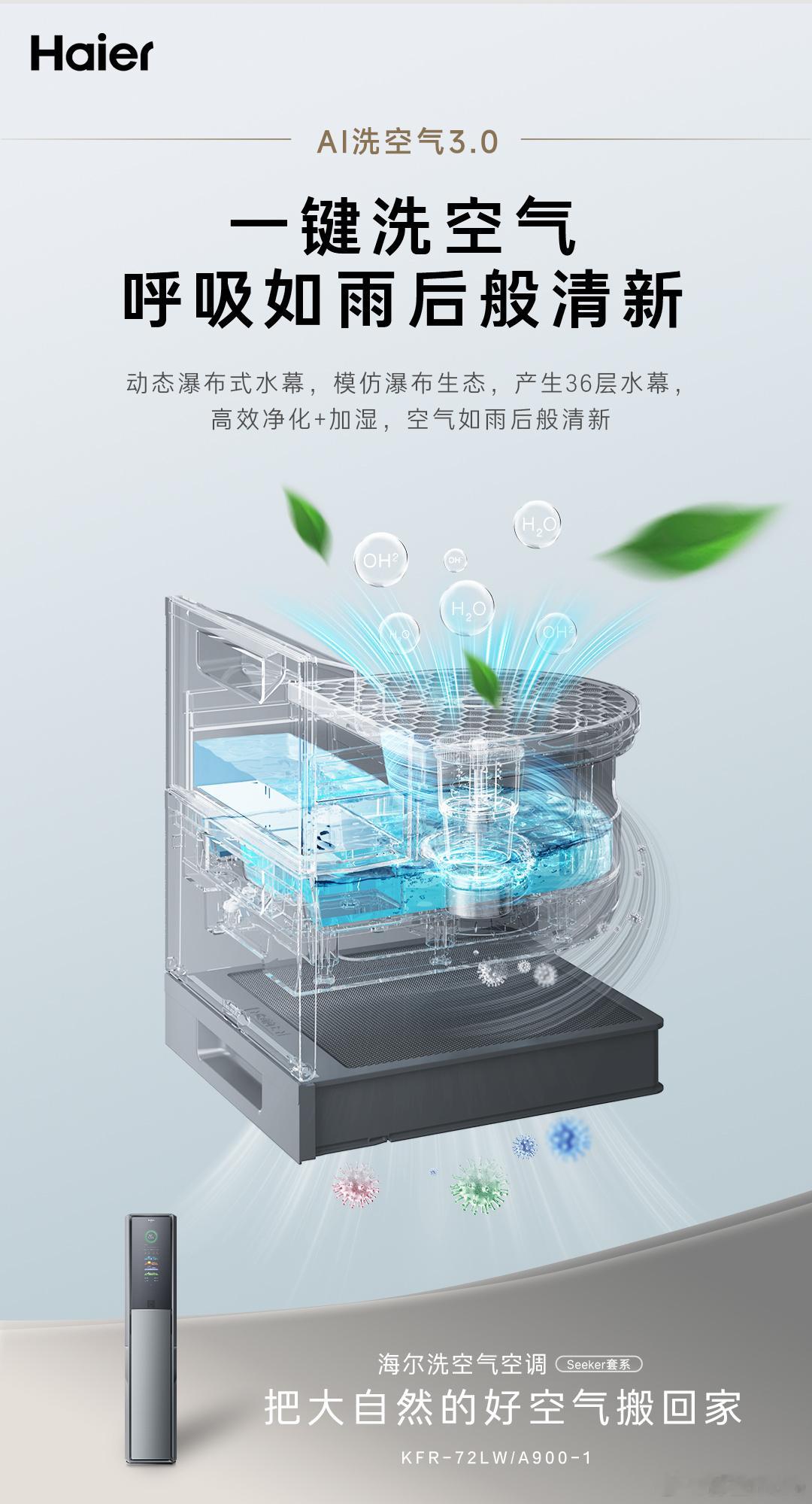 海尔空调把大自然好空气搬回家看到这个话题很好奇海尔怎么把大自然好空气搬回家,原来是通过36层水幕水洗空气,既能净化又能加湿,得到又洁净又水润的好空气。