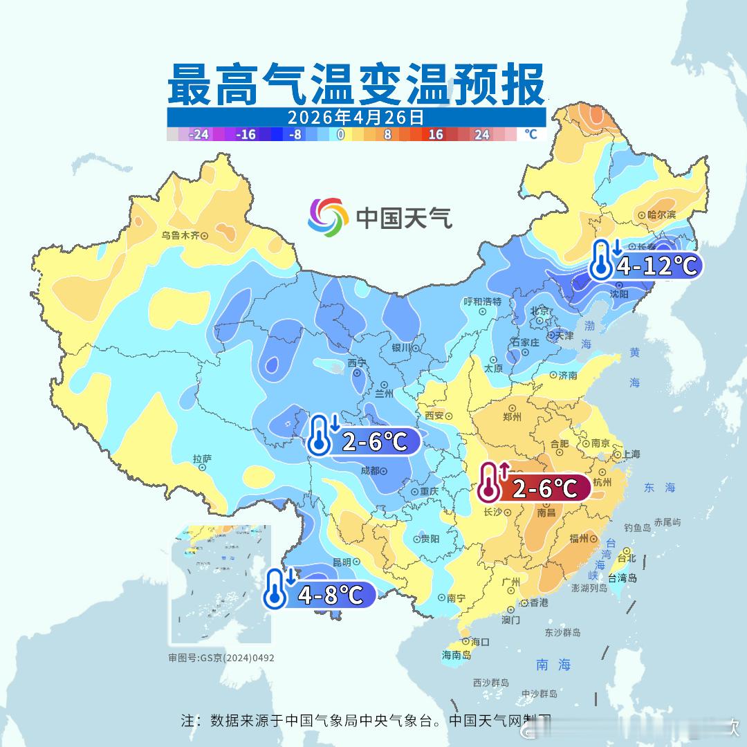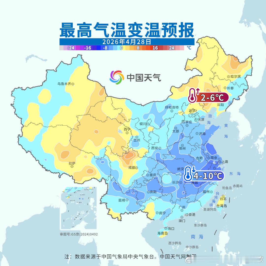 明天降温主要是在东北华北西北以及四川盆地一带。后天降温区更加广阔并向东推进。28日从华北南部到华南多地均会出现降温。从中期预报看,今后10天中东部多地气温可能偏低。