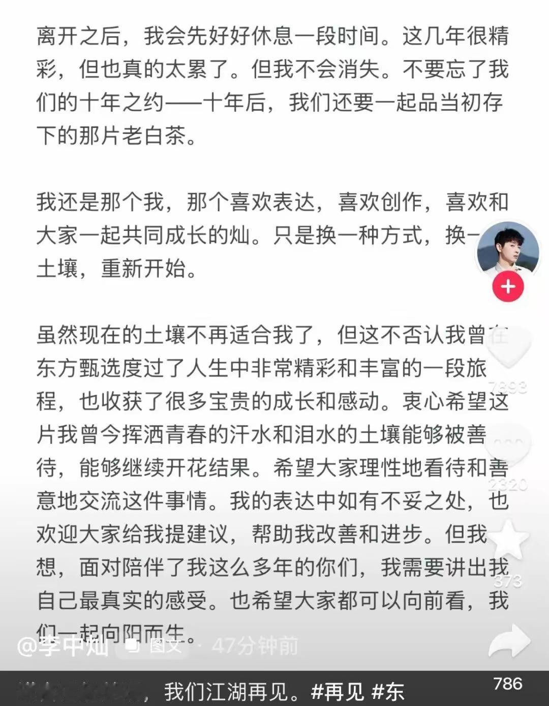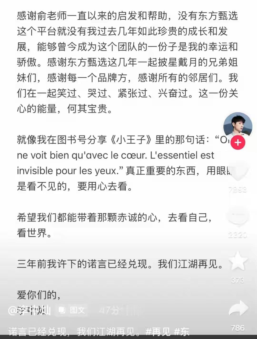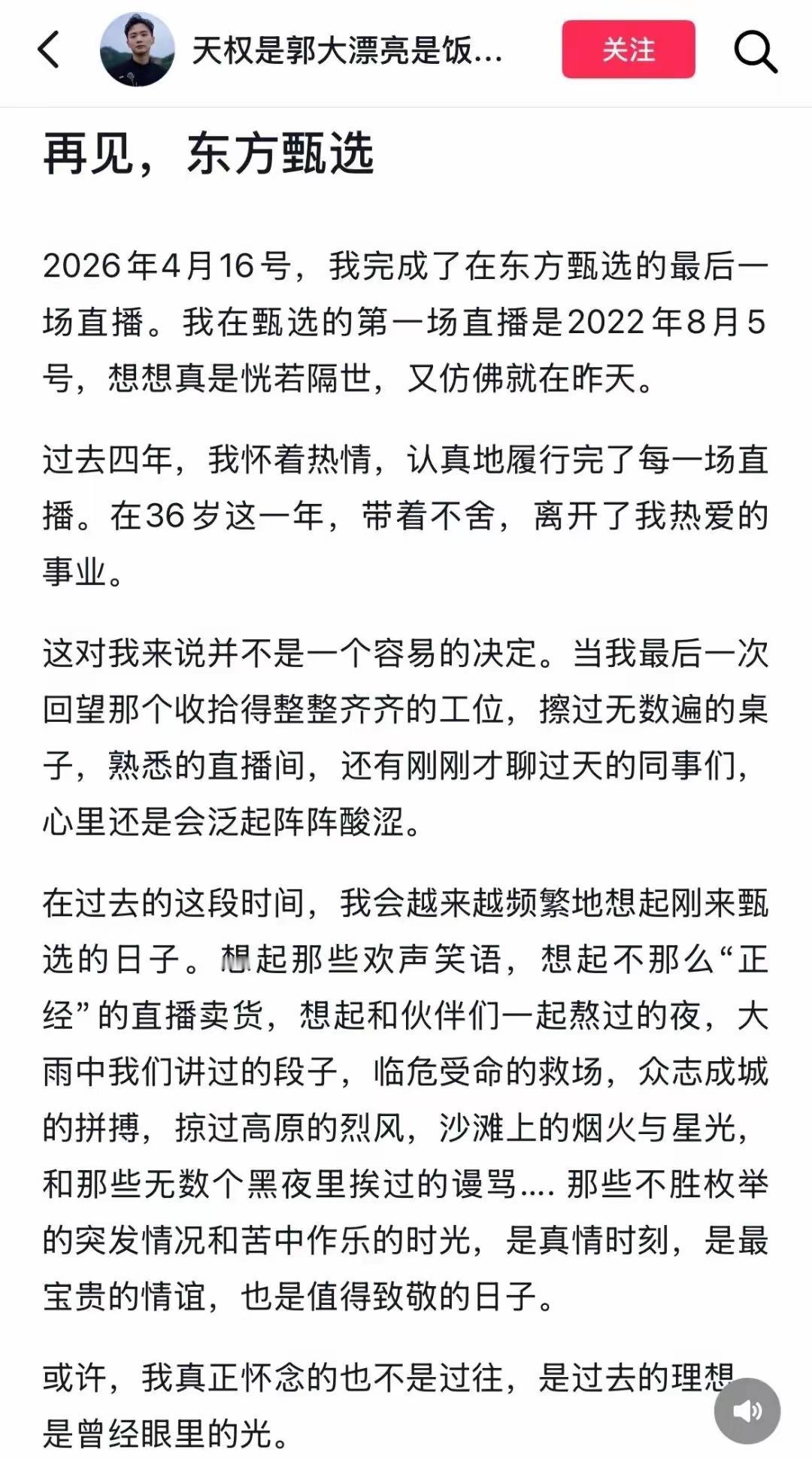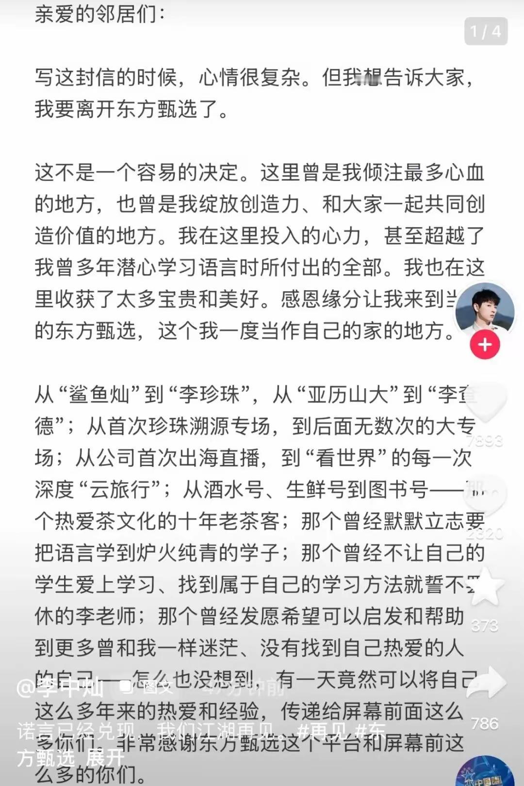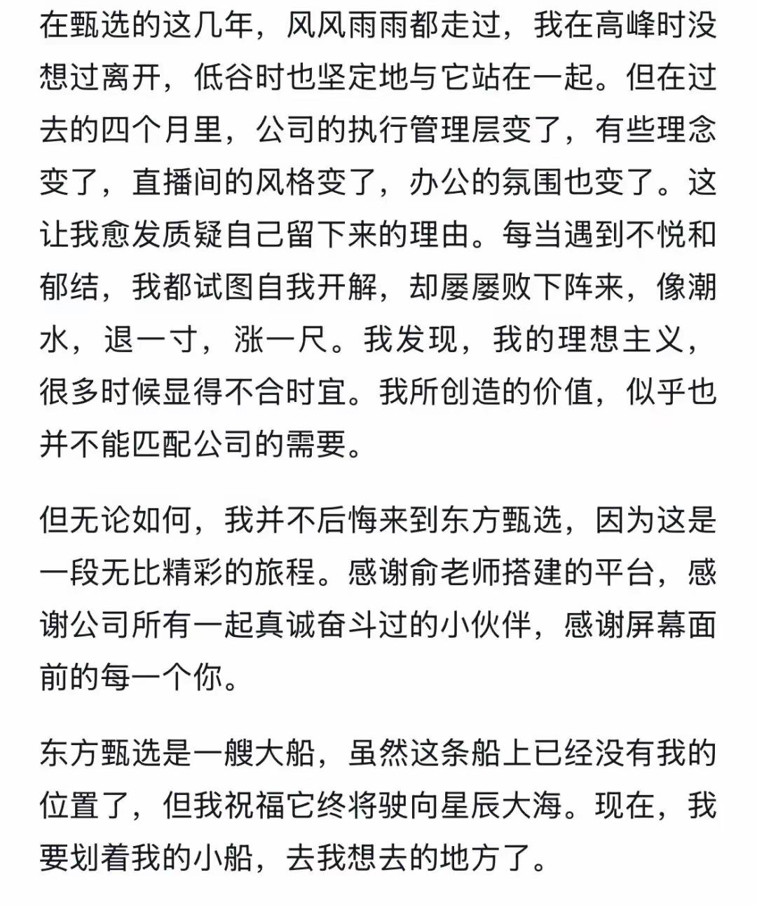 第三,没想到东方甄选的人力资源部都公开发信了,一个公司人力资源部门都走到了舆论场,还说遗憾和不舍,内部的人员变动都跑到了公开的舆论场来说,怎么感觉都有点不对劲呢?