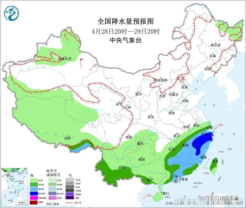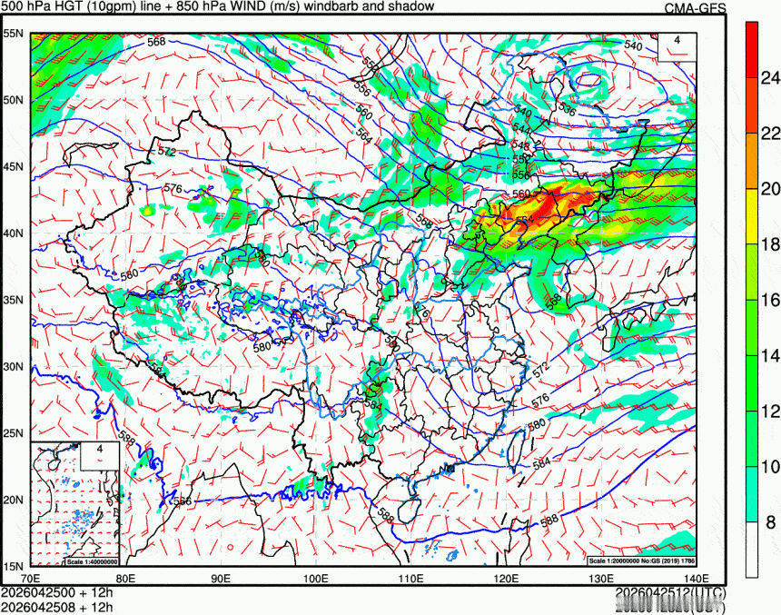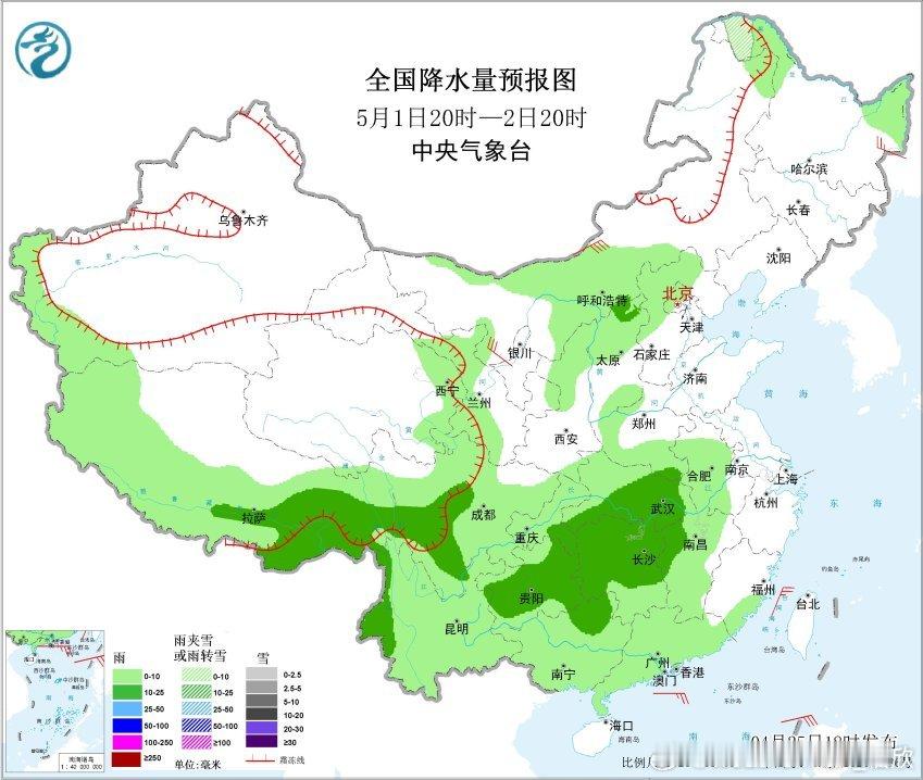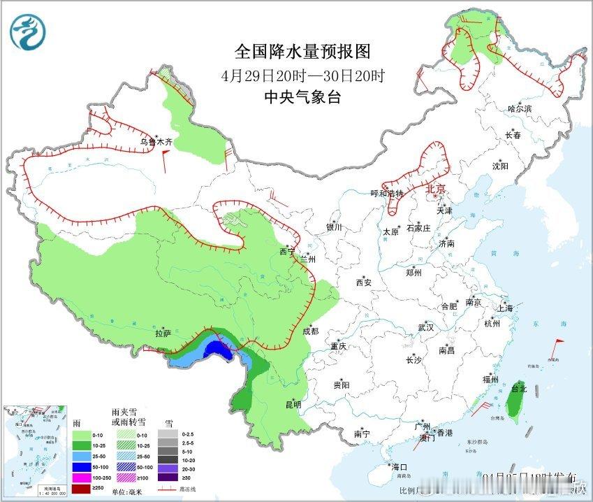 预计4月26日20时至27日20时,川西高原北部、四川盆地南部和东部、重庆大部、贵州大部、湖北中南部、湖南大部、广西大部、云南西部和东北部、西藏东南部等地部分地区有中到大雨,其中,贵州西部和北部、湖南西北部、湖北南部、广西中部和北部、西藏东南部等地部分地区有暴雨(50~85毫米)。