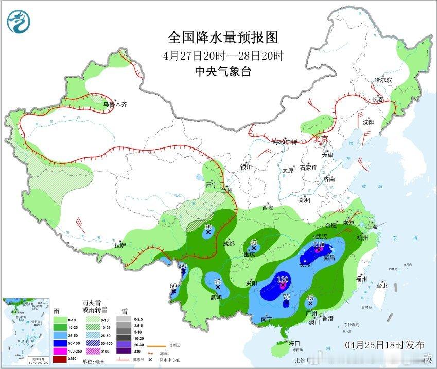 预计4月27日20时至28日20时,四川西部、重庆大部、贵州南部和东部、湖北东部、安徽南部、湖南大部、江西、浙江西部、广西、广东大部、福建西部、云南西北部和东部、西藏东南部等地部分地区有中到大雨,其中,贵州东南部、湖南西南部和东北部、湖北东南部、江西西北部、广西北部和东部、云南西北部等地部分地区有暴雨或大暴雨(100~120毫米)。