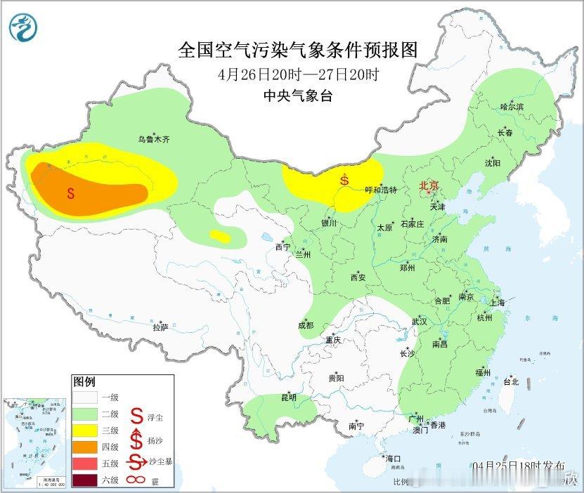 【雾和沙尘】26日夜间到27日晨,河南湖北安徽江苏可能还有一些零散的大雾。另外26日夜间至28日,内蒙古西部、甘肃河西、青海柴达木盆地、新疆南疆盆地等地的部分地区有扬沙或浮尘天气。