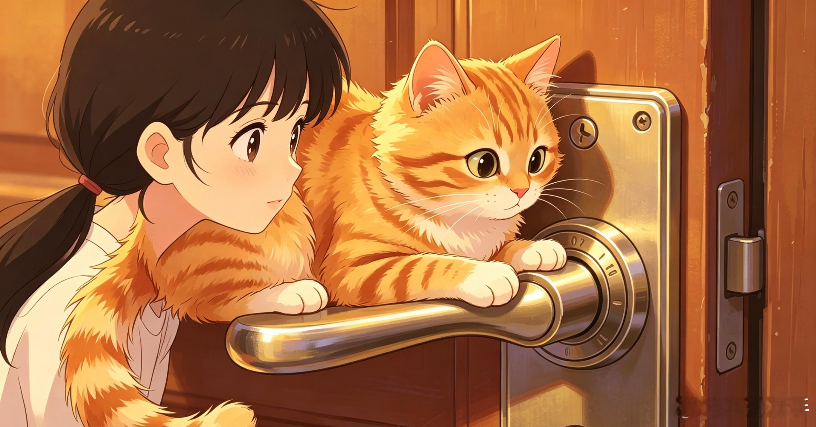 中午外卖到了,我盯着门把手上的猫和门外的骑手,突然福至心灵。给年糕开了罐金枪鱼,趁它埋头干饭的三分钟,我用胶带把旋钮牢牢粘住。