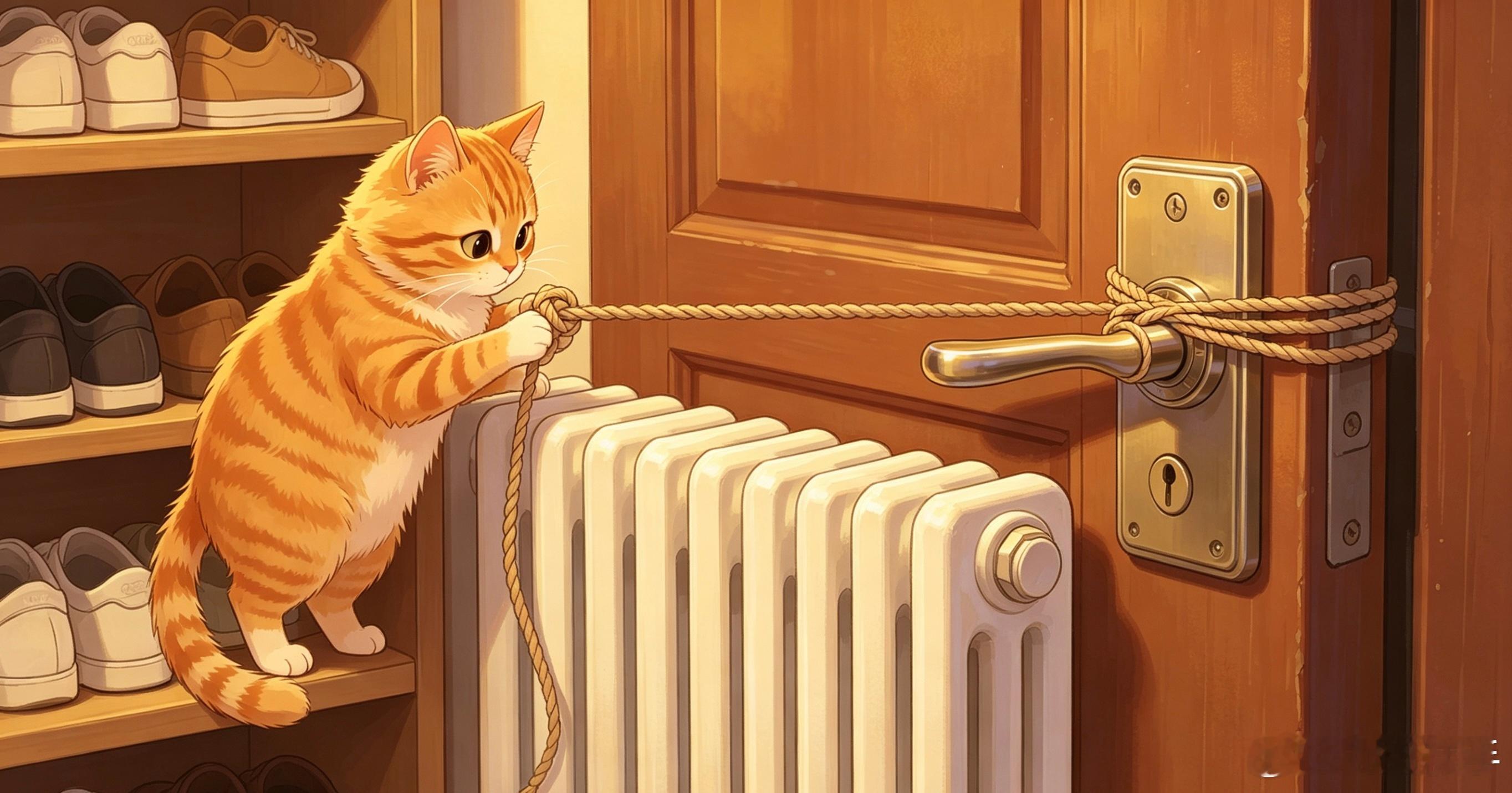 接下来的一小时变成了攻防战。我把它抱回猫窝,转身门就开;用椅子抵门,它从缝隙里伸爪子勾椅子腿;最后我找了根绳子把门把手绑在暖气片上,转头就看见它站在鞋柜上,对着绳结研究得入迷。