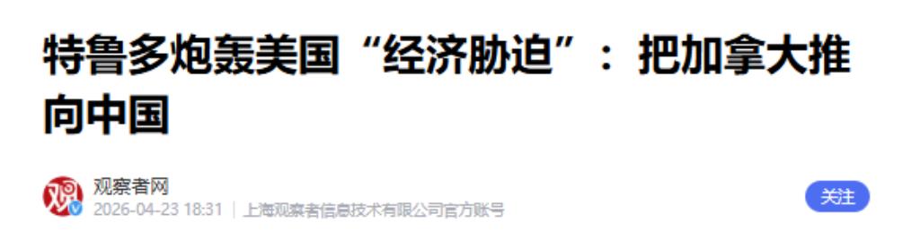 加拿大前总理特鲁多,4月23日在新加坡:CNBC访谈中,开始炮轰美国对加拿大经济胁迫,还称“是美国将加拿大推向了中国怀抱”。