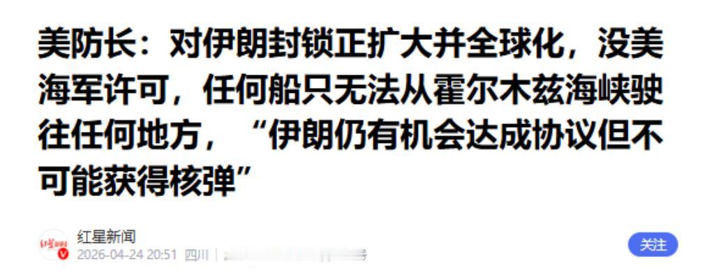 当地时间4月24日,美国国防部长赫格塞思表示,伊朗仍有机会达成一项有利的协议,他称,伊朗仍然可以在谈判桌上做出明智的抉择,但“底线终归是底线,伊朗不可能获得核弹。”