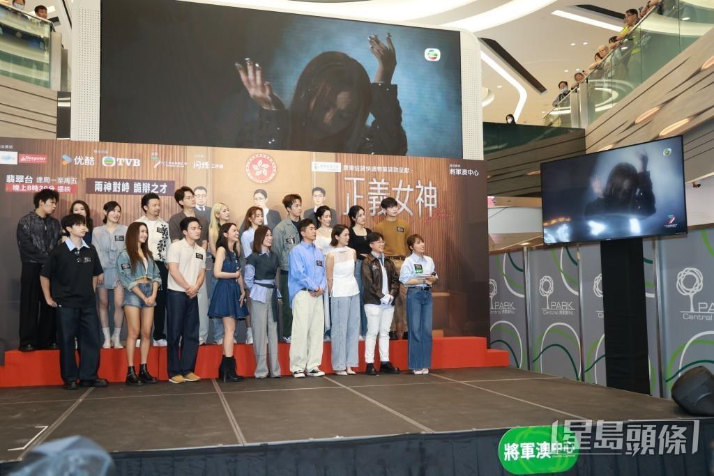 TVB剧集《正义女神》热播,佘诗曼、陈炜、周嘉洛、戴祖仪、马贯东等一众主演,25日现身将军澳出席宣传活动。现场互动玩游戏、派发纪念品,佘诗曼全程贴心为粉丝签名,遇粉丝跌倒亦主动提醒注意安全,作风亲民。受访期间,二人意外透露《正义女神》或开拍前传计划。