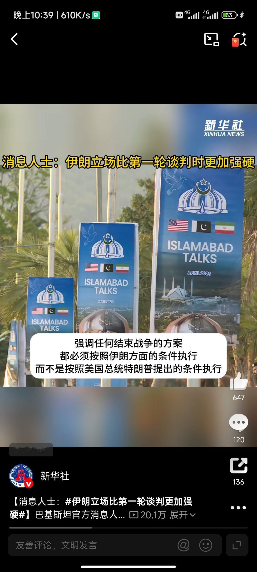巴基斯坦官方消息人士25日告诉新华社记者,与第一轮谈判相比,伊朗这次的立场更加强硬,强调任何结束战争的方案都必须按照伊朗的条件执行,而不是按照美国总统特朗普提出的条件执行。