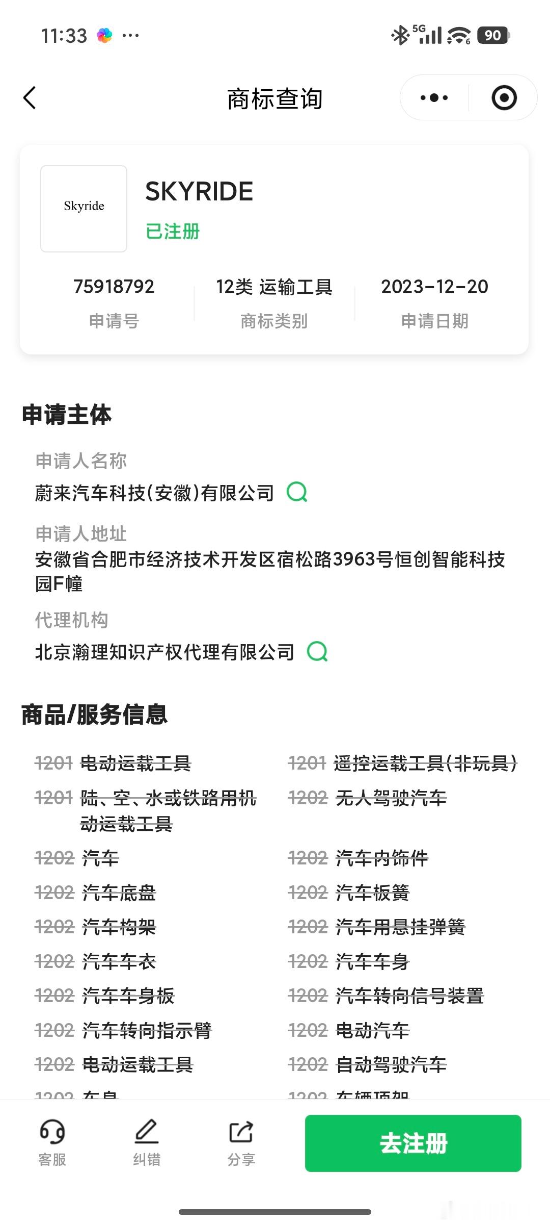 在商标注册网站上来看,蔚来已经把skyride注册了,但是天行……用这个名字的还有点多。