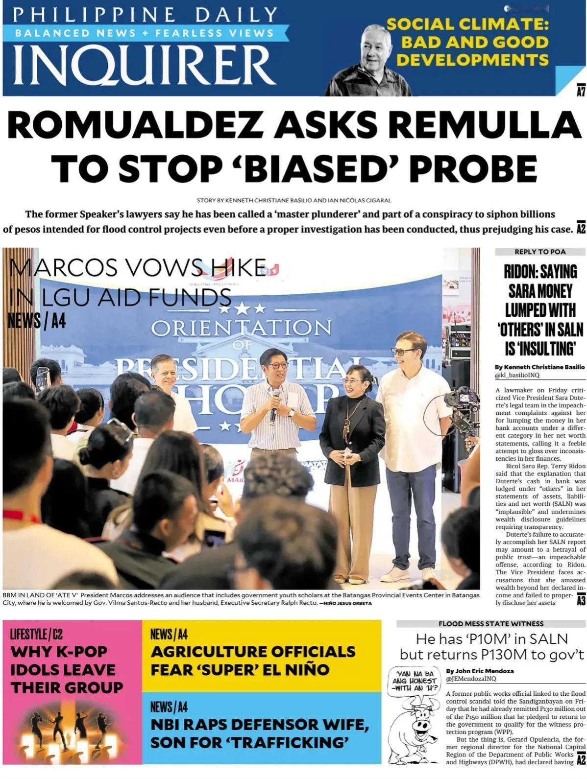 《菲律宾每日问询者报》头版报道称,菲律宾前议长罗穆亚尔德兹要求雷穆拉停止“有偏见的”调查。 这位前议长的律师表示,在尚未进行适当调查之前,他就被称为“主掠夺者”,并被指参与了一个窃取数十亿比索防洪项目资金的阴谋,这是在对他的案件进行预先判断。