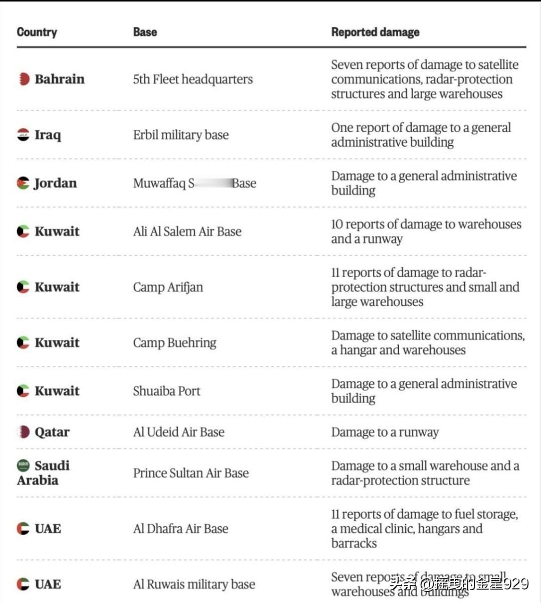 据美国官员和保守派智库的评估,伊朗对美军基地实施打击的目标包括仓库、指挥总部、飞机库、卫星通信基础设施、跑道、高端雷达系统以及数十架飞机。